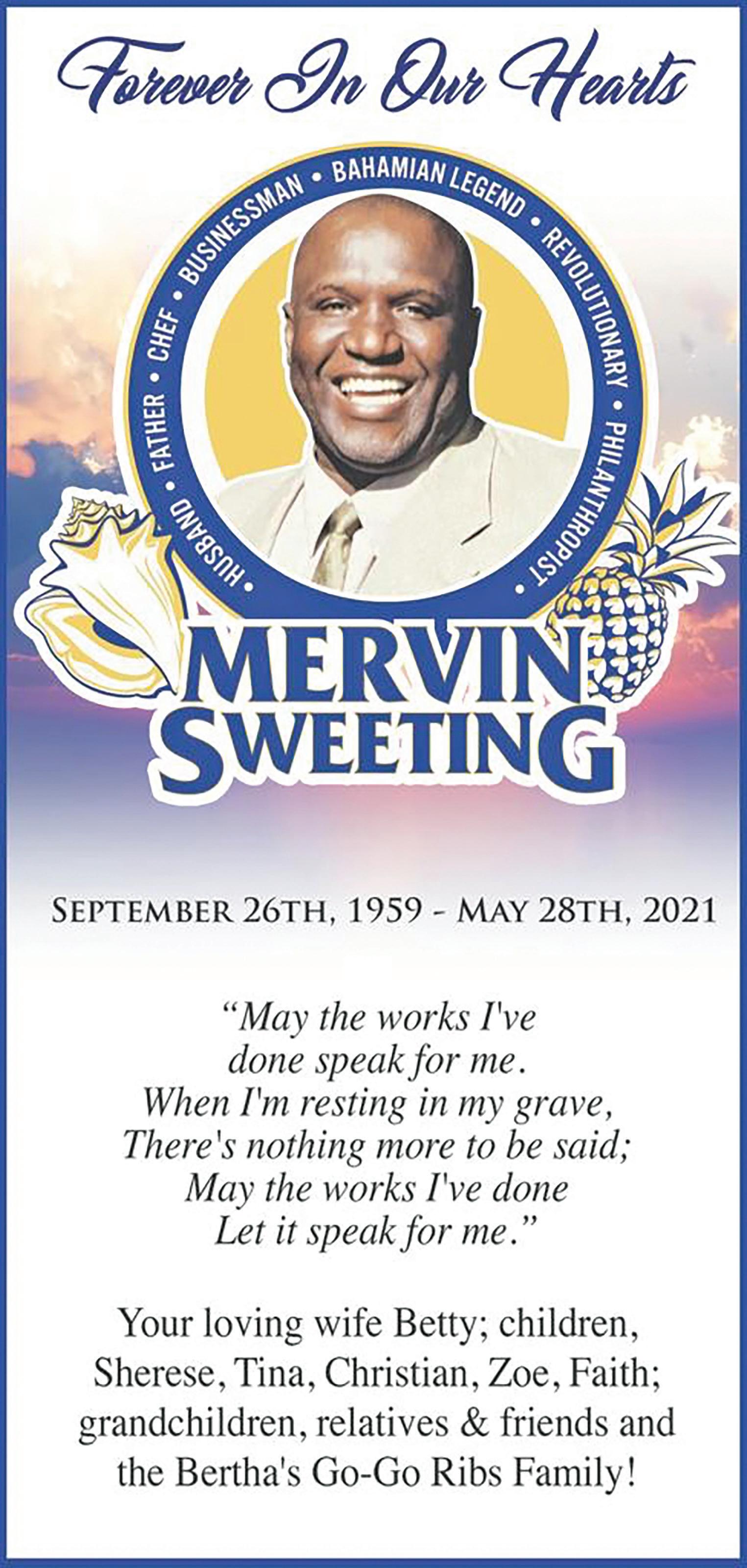 Lataio, Lavietra, Gabby, Calell, Emma Adderley, Conrad (KJ), Chase, David, Kaylin, Kaydine Davis, Felisha, Jasmine and Keva Lockhart, Venesha Forbes, Wellington Jr., Benjamin Rahming, Bradley (Cindy) Bodie, Melbourne Jr., Jessie, Latoya, Nikia (Sheryln), Fredricka, Devon, Jentry Jr., Justin and Jeremy. In-laws: Stephanie, Fiona (James) and Jennifer Sweeting, Angela Lockhart, Patricia Rahming, Judy (Danny) Johnson, Preston, Mark (Joan) and Chief Apostle Jentry Sweeting. Cousins: Sherry, Carolyn, Dave, Jeanine, Janet, Judy, Donnovan, Doneka (Ciara), Dontavia, Adrian, Shane, Samuel, Stephon, Jay, Tasha, Monique, Naldo, Mario, Martin Adderley, Monique, Anius, Latoya, April (Wayde), Monique, Donnell, Misty, Vangy, Cheryl, Shantell, Larry, Darron, Rashad, Carneisha, Evangeline, Terrance, Lynda Bethel, Telica, Tanya, Carol, Raquel, Jillette, Rochelle, Ian, Sherry, Donald Jr., Donald (Lorraine), Dave, Carolyn, Natika, Shawn, Shandell, Nakita, Father Alvardo Adderley, Shaqueel, Keto, Troy, Judy Aiken (Fitzroy), Theresa Albury (Leroy Sr.), Jeanette Gumbs, Raquel Smith (Charles), Rhonda Hepburn (Lynden), Rochelle Ferguson (Osborne Jr.), Rayfield Braynen (Yvette), Leroy Albury Jr. (Deneka), Lemar and Larin Albury, Patricia Oscar (Eddy), Linda, Terry, Kevin, Kevy and family, Keith, Romanoff and family, Nickell and family, Karen, Kyle, Laura Glinton, Mary Turner, David Storr, Fredricker Kernnard, Randolph Ericka and Berkely Rolle, Micheal and Darnell Bain, Cedric and Phillip Dorsette, Mary (Pastor Ricardo) Turner, Marva Storr, Louise Morris, Julia Brice, Deborah (Rudolf) Taylor, John Forbes, Clarence (Charlotte) Brice, Mr. & Mrs. Albert Brice, Shirley Ambrister, Rose Burrows, Coraline, Durly, Mack, Tony, Melanie, Rosetta, Alaska Jr., Jean, Vanessa, Karen and Ressa Dorsette; Adopted brother: Mr. Allison Moss; Adopted Sister:Vernice Heastie. Special thanks to: Lewis Orthopedic and Family, Elder Warren Farquharson, Pastor Lynden Williams, Sister Beverly Smith and Maranatha Seventh-Day Adventist Church Family, the Rev’d Dr. Hamilton, Doctors and Nurses at the Princess Margaret Hospital, Dr. Gonzalez, Ms. Hart, Dr. Duane Sands & Family, Dr. Patricia Forte, Hon. Jobeth ColebyDavis & Family, Quincy Double O Strachan, Nioka Deveaux. Other relatives and friends: Mr. Willy and Family, Robert Dames, Billy, Will & Family, Kayla, Ian (Joyce) Ford, John Moss, Pastor Winston & Mrs. Parnel Barker and Family, Donna Williams, Latina Bain, Bishop J. Carl Rahming, Supt. Crislyn Skippings, Mr. Swaby, Eric, Lawrence, Lindsey, Mr. & Mrs. Francis and Family, Melvin Johnson, Stephanie (Stephie), Wellington Sr., Teresa Pinder & Family, Payton McKenzie & Family, Mia Bullard, Milton II, Ms. Burrows, Ms. Sabrina, Carolyn Braynen, D’emika Brown and Family, Tanesha Taylor, Ava Munnings, Don Johnson, Kendal and Samantha Higgins, Nathan and Shequetta Higgins, O’Neil and Michelle Minnis, Stephen and Melanie Johnson, Grace Funeral Home, Elsie Winder, Michael and Bonita Woodside, Ms. Dominique Rolle, Dr. Cho, Dureonte & Marliyah, Dawn, Akito, Frank, Luna Smith and Braylen, Annejo (Fisherman) & Family, Sabrina Usher, Nursing Officer Lyndianna Rahming, Mr. Reuben Sears, Mr. & Mrs. Munroe, Knowles & Family, Mr. Major and Family, Mr. & Mrs. Knowles, Tinker Family, Brice Family, Adderley Family, Sweeting Family, Hanna Road Family, Mark, Joe Farrington Road, Seabreeze Family, Marigold Farm Store Family, Eric & Shonna Davis and Family, Williams Family, Daxon Family, Laing Family, Ferguson Family, Treco Family, Department of Public Service, Ministry of Finance, the entire Fox Hill Community, Lumumba Road Family, Bernard Road, Kemp Road Family, Ms. Morris, National Insurance Board, Department of Social Service, Pat, Shaggy, Mr. Ilest (Mamie) Jean, Joseph Carroll; and a host of other relatives and friends too numerous to mention