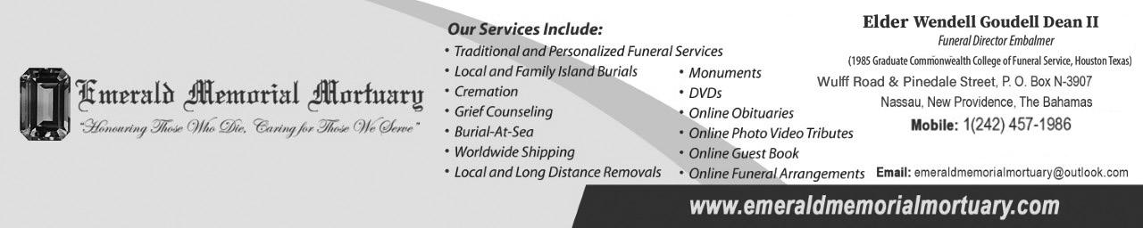 Left to cherish his memories are his wife: Merle Ingraham; mother: Iris Ingraham; step daughter: Carla Grey; step son: Walter Grey II; grandchildren: D’shantae, Walter III, Denreka, Kenya, Katrel, Kashell, Cayden and Torrick; great grandchildren: Torryka, Torrrick Jr. and Torrajah; sisters: Iris Ingraham-Deton and Rose Hamilton; brothers: Philip Ingraham and Enoch Ingraham Sr.; uncles: Rodger Demeritte and Darville Demeritte; grand aunts: Adlean Knight (Miami, Florida) and Victoria Demeritte; sistersin-law: Shirley Duncombe, Lavern Ingraham and Pearline Brown; brothers-in-law: Christopher Brown, Karon Deton and Vincent Walks; nieces: Philippa Cash, Joy Ingraham, Mia Ingraham, Amanda Hanna and Akoya Pennerman; nephews: Edison Newry Jr., keno Deton, Jonathan Deton, Wilbert Flowers, Bertrum, Enoch Ingraham Jr., Wilbert Ingraham, Philip Ingraham Jr., Selris Hamilton, Ricardo Bullard, Sharvado Demeritte and Don Bain; grand nieces and nephews: Amari Kemp, Isiah Bullard, Dominique, Kaylee Deton, Curtrinique Cash, Dominiqua, Larenzo, Cimia Cash, Caleb Cash, Aura Bullard Adena, Brielle Bullard, Leiyah, Deshantae, Adrianna Bethel, Devantae, Don Jr., and Jamal Jr.; special friends: Plywood, Gervase Munroe, Campari Resturant and Bar, Vaughan Albury, Kiffer Sporting Lounge, Carlene Bain (god sister); and a host of relatives and friends including: Stephanie Bethel and family (Eleuthera) Sandra Young and family (Eleuthera), Paula Bethel and family (Eleuthera) Laverne Henfield and family, Sheila Knowles and family Michelle Dames and family, the late Ellen Johnson and family (Eleuthera)