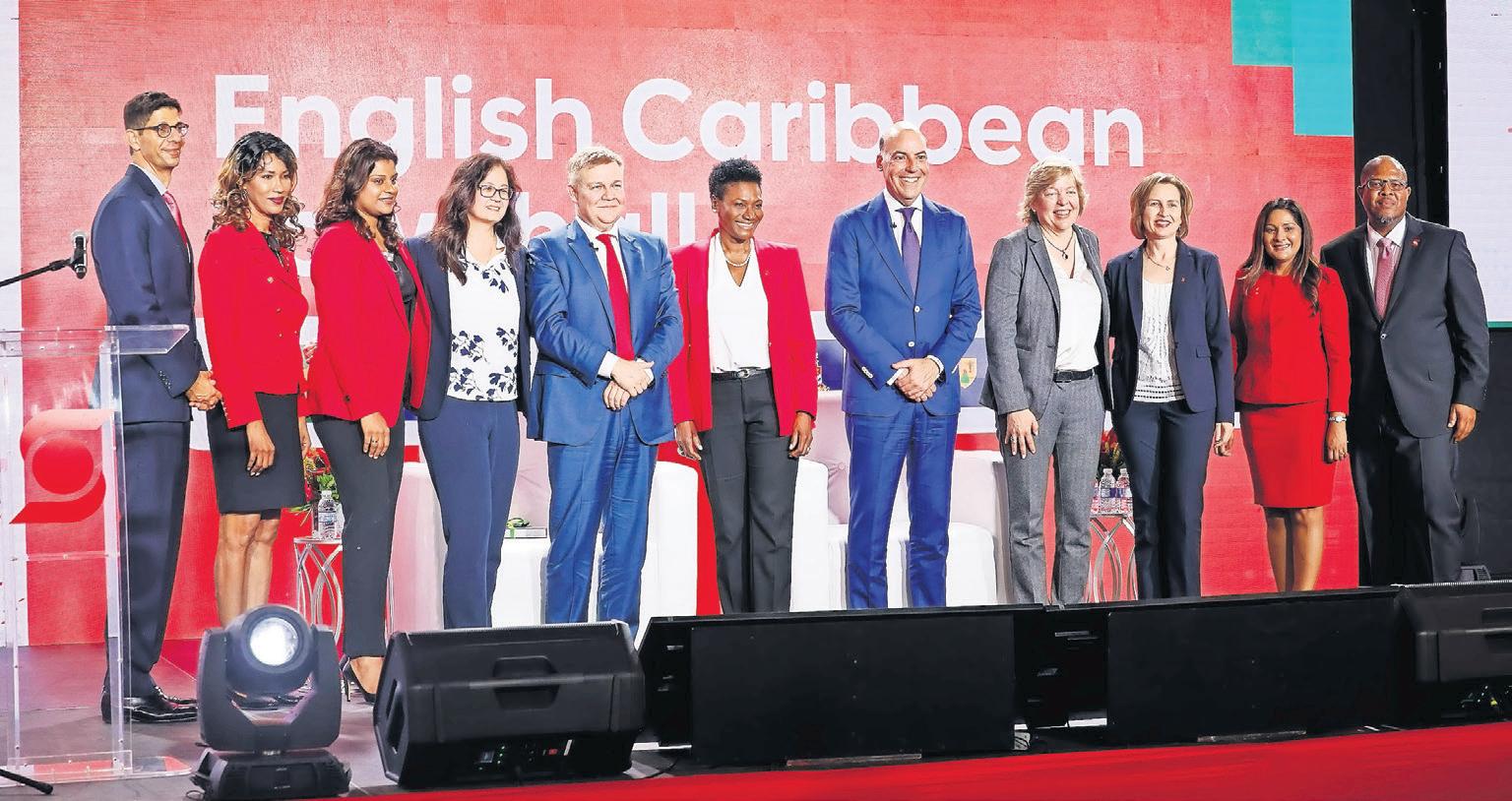 LEADERS from Scotiabank’s English Caribbean region on stage during a global strategy summit hosted by Scott Thomson, Scotiabank’s global chief executive.