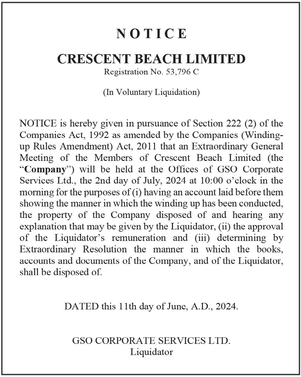 Pursuant to the provisions of Section 222 (2) of Te Companies Act, 1992 notice is hereby given that an Extraordinary General Meeting of the Members of ROADLINK LTD. will be held at the Ofces of PDC Corporate Services Ltd. In No. 204 Safrey Square, East & Bay St in the City of Nassau on the 6th day of June, 2024 at 12 o’clock in the afernoon.