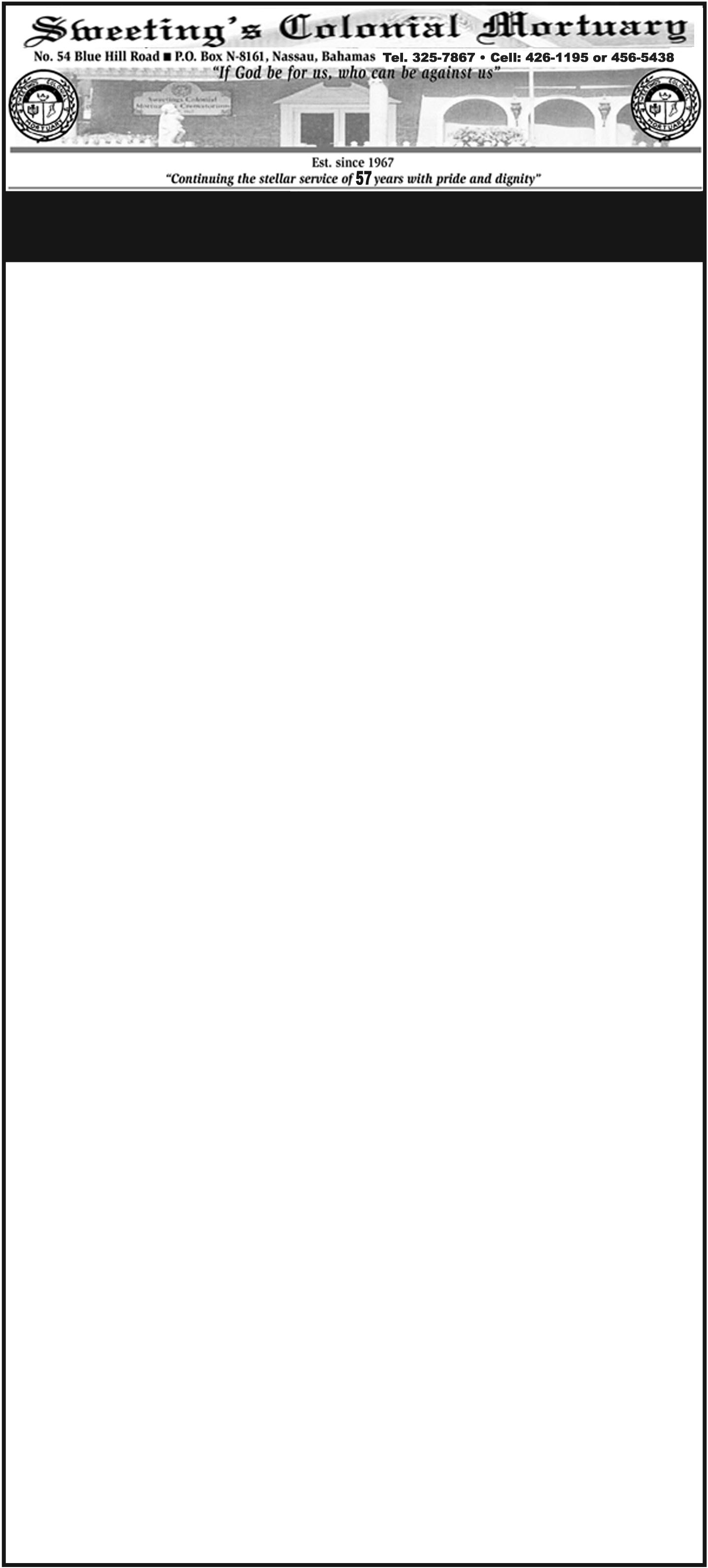Left to cherish his fond memories, Wife: Sharon Smith. Sons: Manassah, Boenanza, and Shamar Smith. Daughters: Victoria and Shanoya. Grandchildren: Hayden, Regina, D’metri, D’mari, Nye’Asia, Bre’lani. Mother: Eleanor Dorsette of the Cove Cat Island. Brothers: Jeffery, Rodrick and Ben Smith. Sisters: Tendarina Dorsette, Loretta Smith and Lilian Clarke. Daughter-in-Law: Shanice Smith. Sister-inLaw: Maxine Deleveaux, Glenda Bethel, Arlene Hall. Brother-in-Law: Patrick Pyfrom. Nephews: Marvin Johnson, Leading Seaman (R.B.D.F) Shaquille Miller, Prince Clarke Jr., Bertram Jr., Cameron, Toney, Jay, Francis, Jerome, Alvin, Joe, Samie, Nathaniel, Anthony and Boldy, Reno, Link. Nieces: Mya Johnson, Cynthia, Kim, Ingrid, Iva, Bedneia, landara, Lashann, lazarl Clarke, Val. Other Relatives and Friends: Darren, Keith, Phillip, Jay, Jeff, Andrew, Ulysses, Gary, The Doctors and Nurses of Princes Margaret Hospital, The community of Cove Cat Island, valuable customers of the Carmichael Road Community and valued staff at New Beginning.