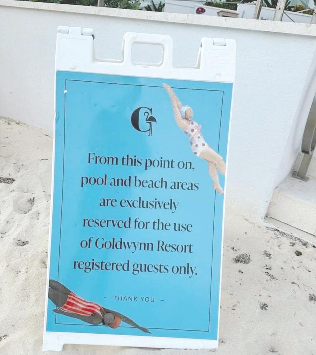 The sign said: “From this point on, pool and beach areas are exclusively reserved for the use of Goldwynn Resort registered guests only.”