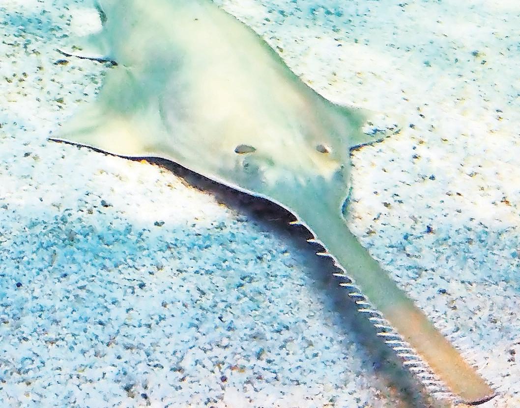 The Smalltooth Sawfish tend to be found in shallow water, near shore areas, and are particularly fond of the mangrove with a muddy or sandy bottoms.