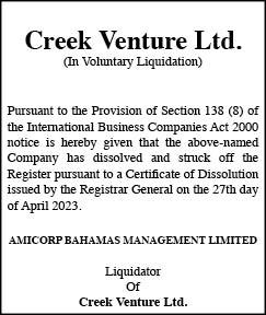NOTICE is hereby given that BARBARA MARY EIROA GOMEZ, of P.O .Box N266 Cloister Drive West, New Providence, Bahamas applying to the Minister responsible for Nationality and Citizenship, for Registration Naturalization as a citizen of The Bahamas, and that any person who knows any reason why registration/naturalization should not be granted, should send a written and signed statement of the facts within twenty-eight days from the 28th day of June 2023 to the Minister responsible for nationality and Citizenship, P.O. Box N-7147, Nassau, New Providence, The Bahamas.