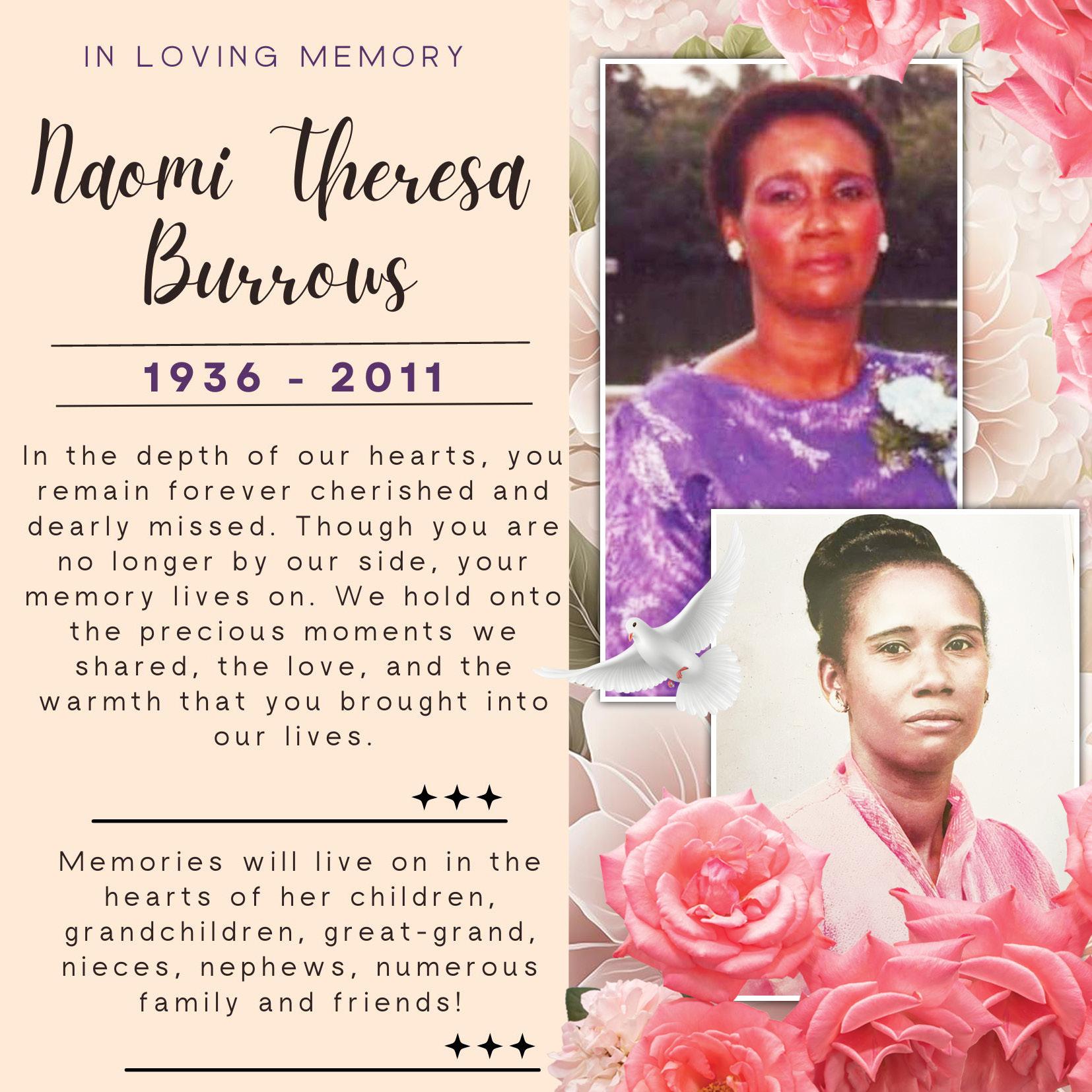 Left to cherish her memory are her son: Anwar Tynes (Candida); grandchildren: Cyril Tynes, Arianna, Tynes Eliesel Tynes and Isamal Tynes; sister: Edna Ijeoma; brothers: Harvey Tynes (Ingrid) and Philip Tynes; daughter-in-law: Maricela Tynes; nieces and nephews: Chigozie Ijeoma (Renee), Chinyere Ijeoma, Uchenna Delva (George), Nneka IjeomaButler, Tanisha Tynes-Cambridge (Gordon), Ntshonda Tynes, Terrelle Tynes-Wilson (Alexander), Heather Tynes-Lewis (Iram), Makeisha Stoute, Oneshea Tynes, Michael Tynes, Keith Seymour (Stephanie), Franklyn Seymour (Vivian), Andrew Seymour (Marsha), Anthony Seymour (Victoria), Celestina Bent (Dudley), Arthur Seymour (Rhonda; grand nieces: Anastasia Butler, Grace Wilson, Alexis Wilson and Belle Wilson, Jasmine Lewis, Tammy Rahming, Krystal