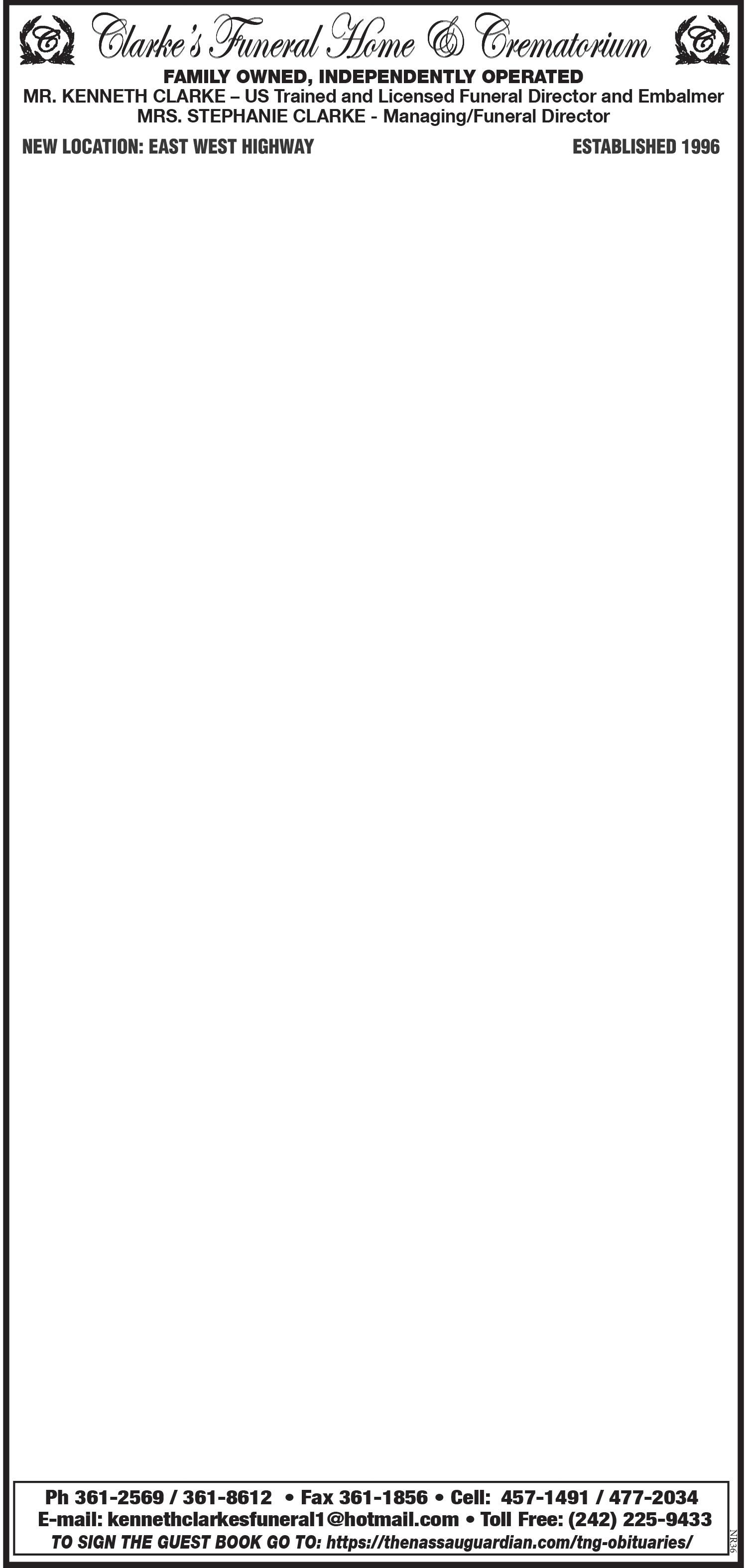 died on Wednesday, June 28, 2023 will be held at Palestine Union Baptist Church, The Forest, Exuma, Bahamas on Saturday, July 15, 2023 at 10:30 a.m. Officiating will be The Rev’d Lynden Clarke - 2nd Assistant Superintendent, Bahamas Baptist Union, Pastor, Palestine Union Baptist Church, The Forest, Exuma assisted by The Rev’d Bradley Clarke - Associate Minister, Palestine Union Baptist Church, The Forest, Exuma. Interment will foll in The Forest Public Cemetery The Forest, Exuma, Bahamas.