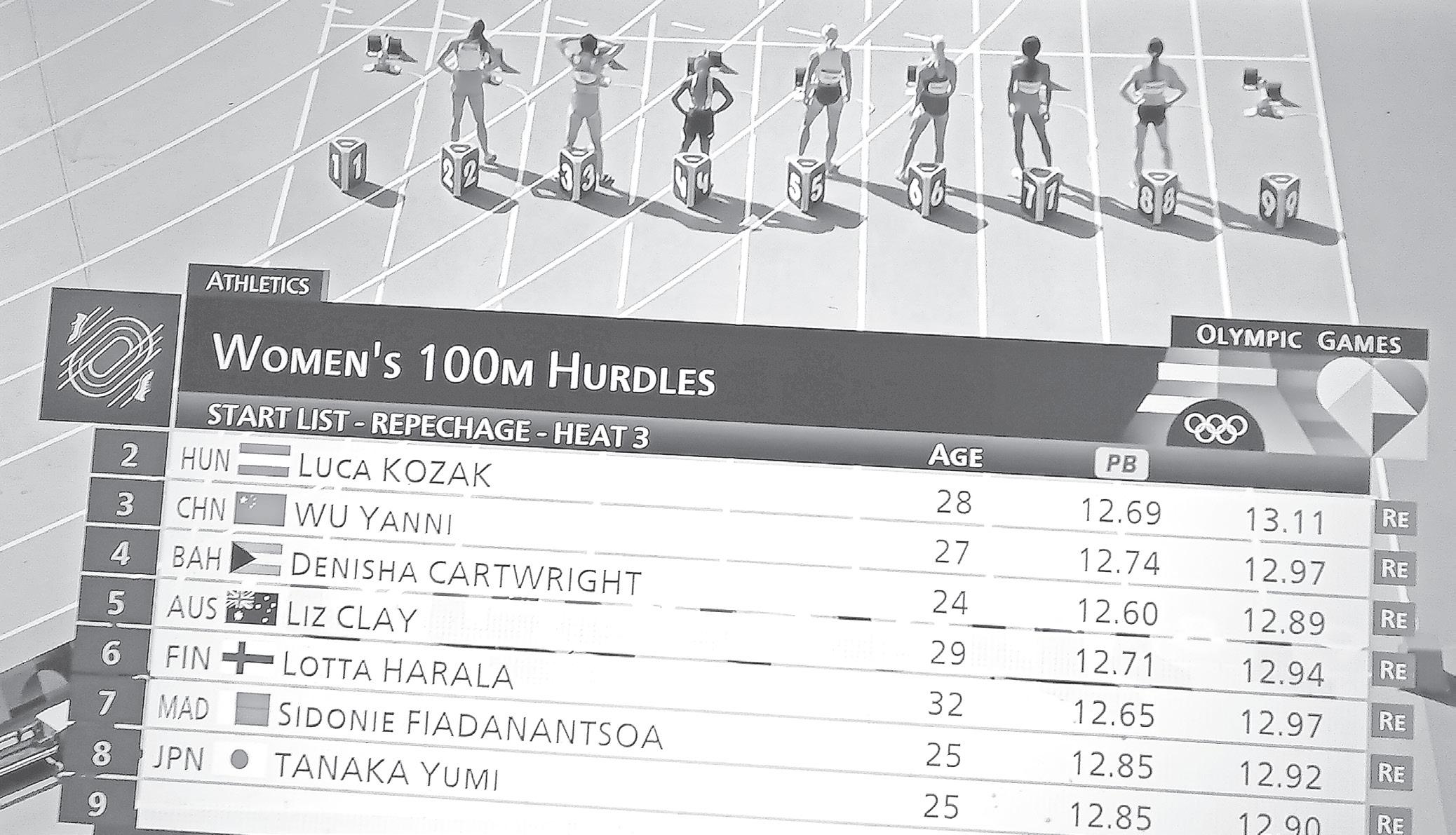 Cartwright, sporting a reddish hairdo, actually was the first out of the blocks and over the first of the ten flights of hurdles. Running out of lane five, she clipped the second hurdle and it slowed her down a bit.