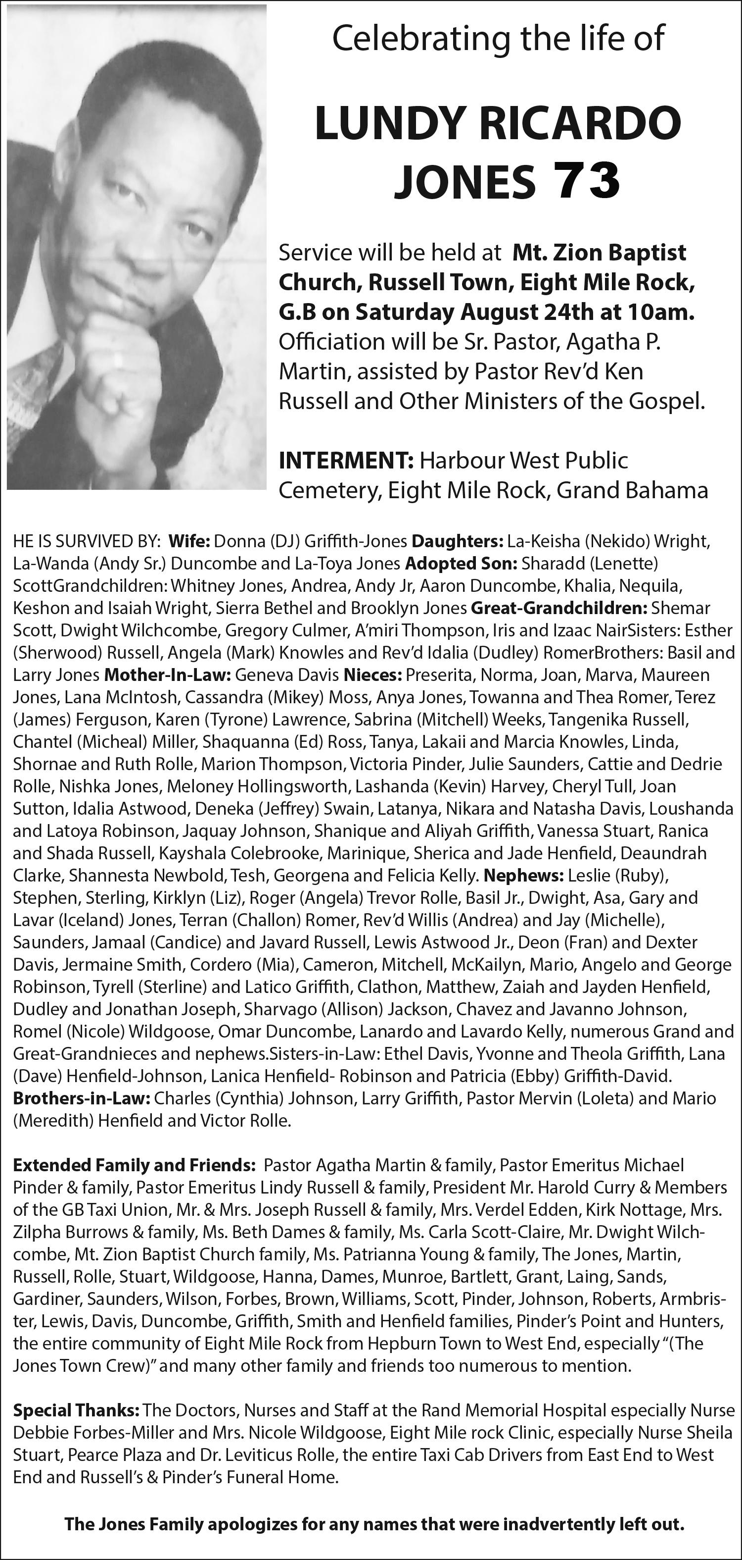 He is survived by his wife: Natasha Bullard; children: Hensil “Moe” Miller (Jonnise), Sgt Jill Bullard, Tokoya Bullard, Vernita Bullard, Andrea Kelly (Shavan), Natasha Farquharson (Tanario), Frankie Miller; Papa babies: Asjiahna Bullard, Josil Miller, Brandon Rolle, Elnita Carti, Dakari Burrows, Jaiden Kelly, Tokoya Bullard, Jeral Allen, Henlena Miller, Azaria Kelly, Tafari Farquharson, Isana Farquharson; adopted son: Gasman Hepburn; brothers: Andrew Miller Sr. Harrison Miller; sister-in-law: Jenny Miller, Marguretta Miller; cousin: Stephen Martin; nephews & nieces: Sonia Miller, Errol Miller Jr., Tamara Miller, Mervin Miller Sr., Harrinique Miller, Andrew Miller Jr., Corey Bodie, Ozia Bodie, Ophira Bodie-Taylor (Vernal), Jessica Curtis (Hurvin), Nadine Pinder (Pastor Israel), Joan Morris, Dionne Rolle, Ricardo (Ricky) Jones; grand nieces & nephews: Shamal Miller, Stephen Allen, Stephon Allen, Samuel Knowles, Shamiah Knowles, Tyquan Miller, Denard Miller, Skylah Miller, Nardo Miller, Mervin Miller Jr., Royalty Adderley, Garvae Miller, Jamaal Ferguson, Andrew Miller III , Anquanique Miller, Valentino Cooper, Keemai Taylor, Tristen Smith, Janiah Curtis, Jaliyah Curtis, Daneka Sands, Tejay Butler, Shavonna Morris Merjee Laing, Keanu Morris, Warren Rolle, Wolly J. Rolle, Walton Rolle, Ricardo Jones Jr., Richard Jones, Rakell Jones; great-grand nieces & nephews too numerous to mention; godchildren: Dereese Burrow, Deleese Burrows, Cathea Johnson, Malica Johnson; other loving family and friends included but not limited to: Pastor Micheal & April Garvey family, James & Darlene Culmer Family, Michael & Sheila Gaudy (kids), Deweese Burrows Sr & family, Delores Frith & family, Gwen Garvey, LeShawnique Nesbitt, Mercedez Evans, Nyashia Hyler, Charles Adderley & family, Michael & Moses Moxey, The Rolle family, The Hanna family, The Wilchcombe family, The Neely family, The Smith family, Rev. Ella Charlton & Family, Yvette Farrington, Frank Missick & the Pinders Point Crew, St. Peter’s Baptist Church, The Church of God of Prophecy West End, Paster Roosevelt Rolle & Family, Old Bahama Bay Guest & Staff, St. Michael‘s Catholic Church, New Life Church, Apostle Anthony & Anna Grant Family, (Agape House) and the entire West End Community!!!