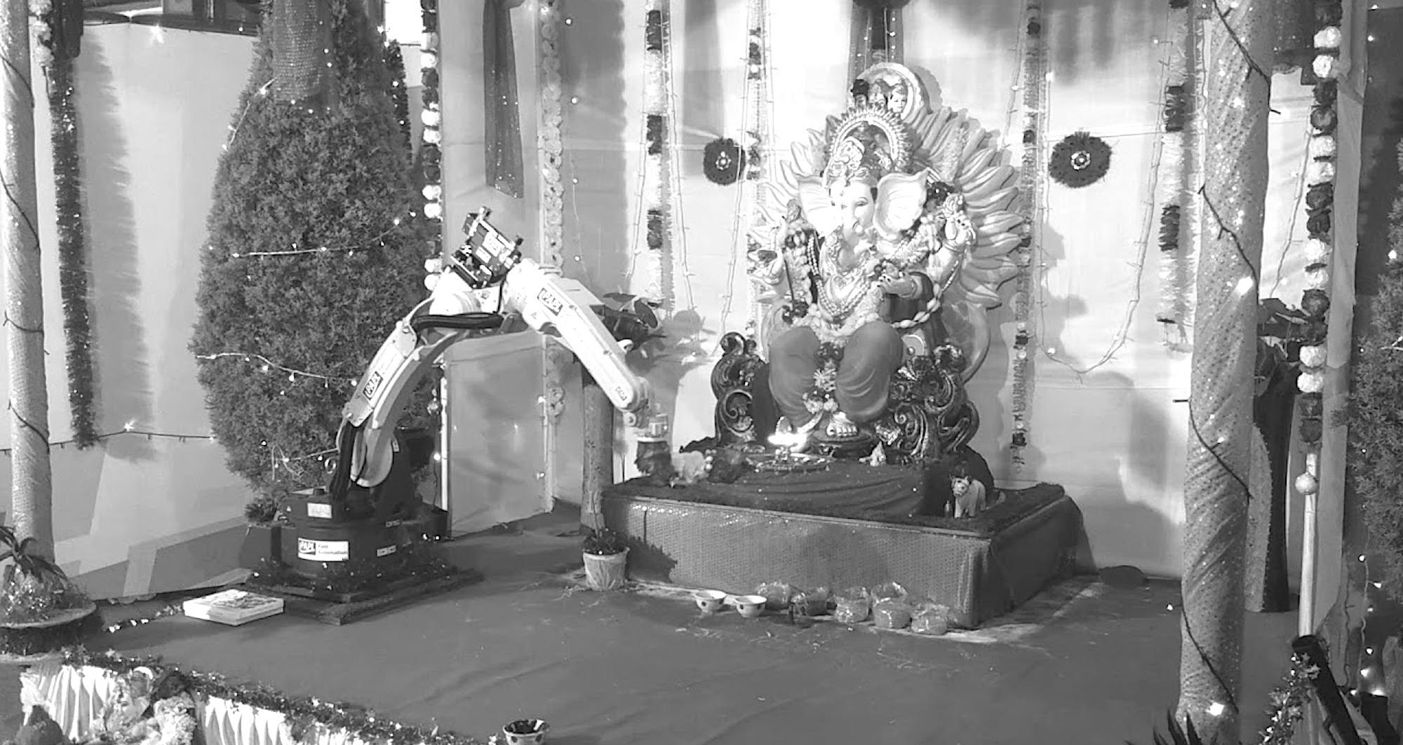 A ROBOTIC arm is used to worship by maneuvering a candle in front of the Hindu god Ganesha during a religious ritual.