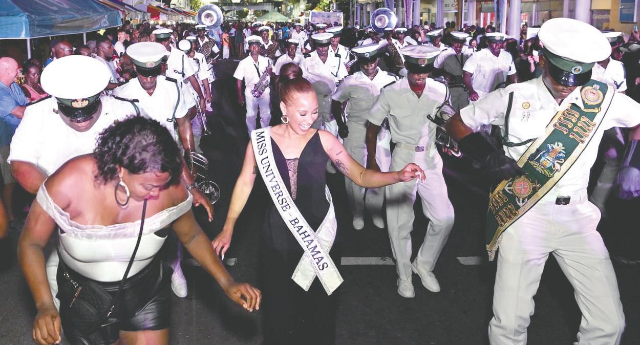 MISS Universe Bahamas Melissa Ingraham joins the Royal Bahamas Defence Force band during the final night of Goombay Summer Festival 2023, downtown Nassau, on Saturday.