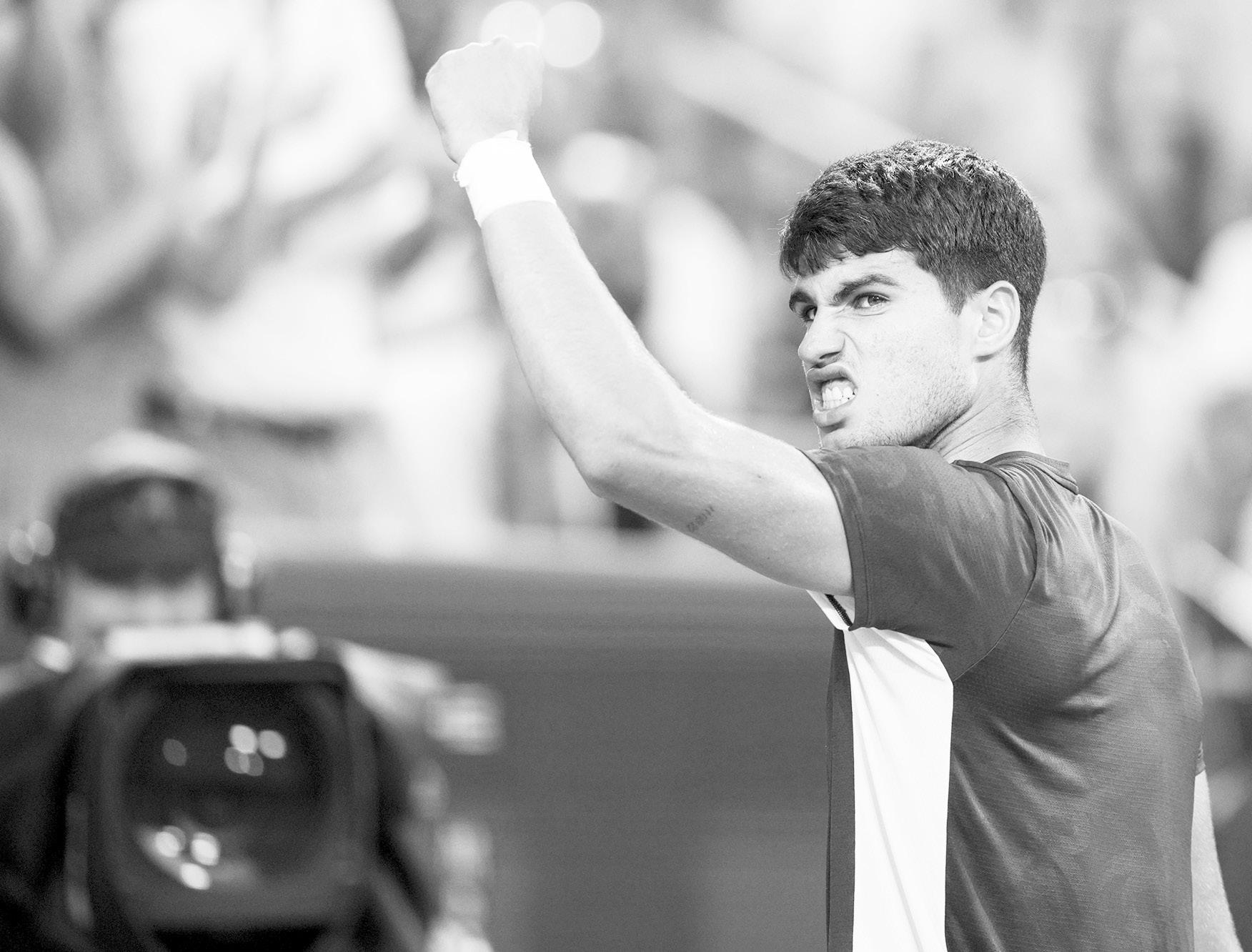 CARLOS ALCARAZ, of Spain, reacts after winning a point against Novak Djokovic, of Serbia, during the men’s singles final of the Western & Southern Open tennis tournament, on Sunday, August 20, in Mason, Ohio.