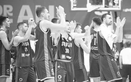 SERBIA team celebrate after winning against Dominican Republic during their Basketball World Cup second round match at the Araneta Coliseum, Manila, Philippines, on Sunday.