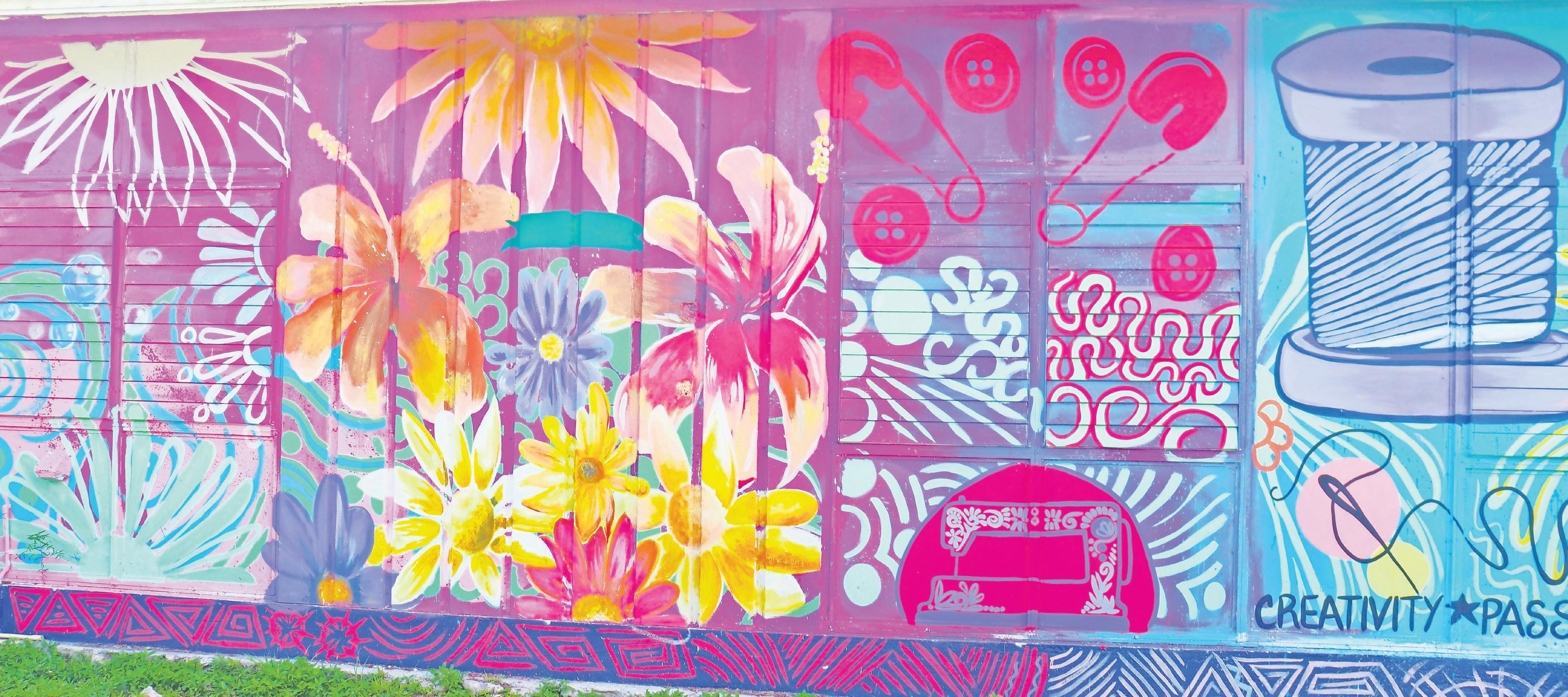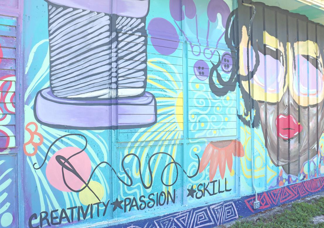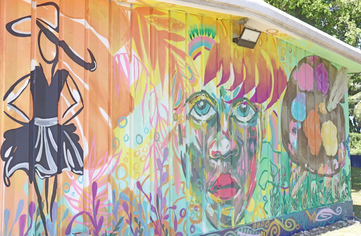 ART is meeting fashion at the Bahamas Technical and Vocational Institute (BTVI) - with a mural courtesy of artist and paint mixologist Kristopher Ellis. The Fashion and Design Studio at the campus, which faces Old Trail Road, is now an eye catcher for passersby thanks to the mural featuring a processional of cartoonishly rendered tubes and buckets of paint, juxtaposed by showy silhouettes of haute couture and set against a summery floral backdrop.