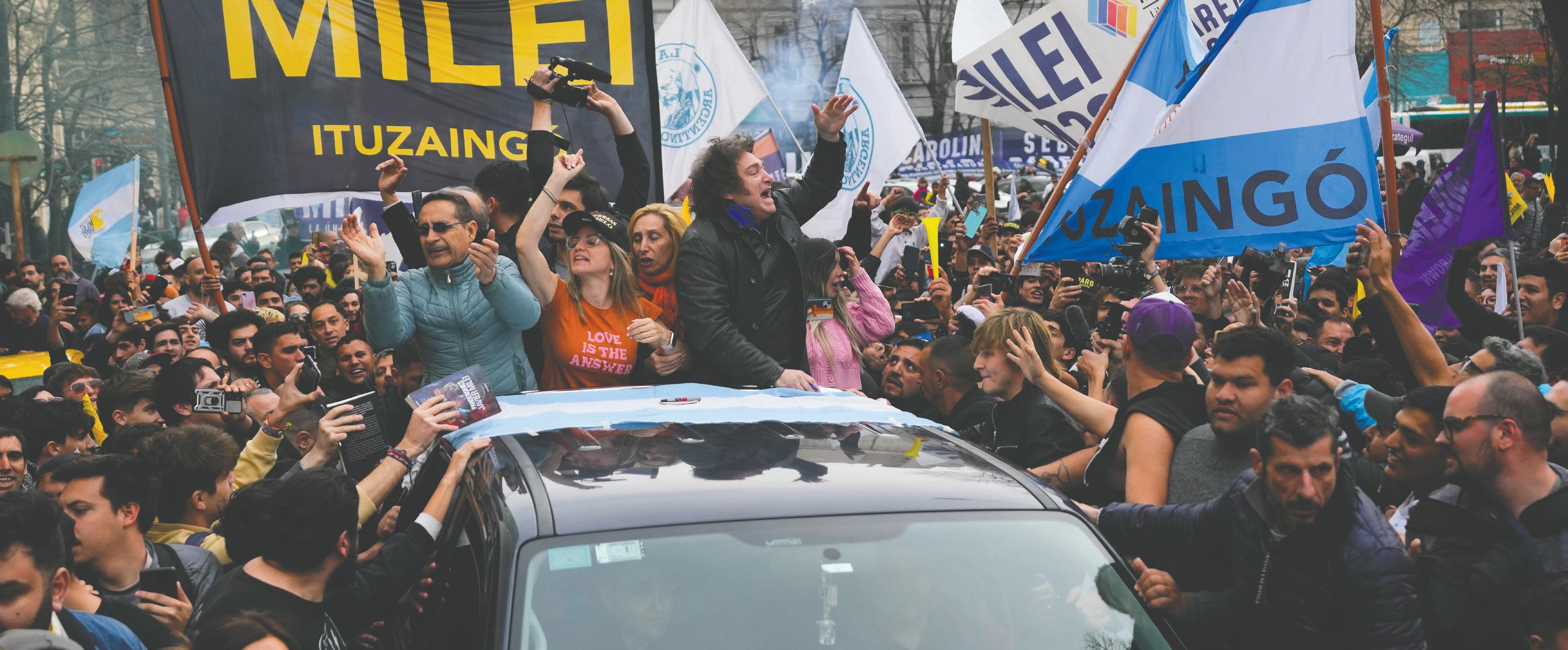 PRESIDENTIAL hopeful of the Liberty Advances coalition Javier Milei, centre, waves during a campaign event in La Plata, Argentina, on Tuesday. General elections are set in Argentina for Oct. 22.