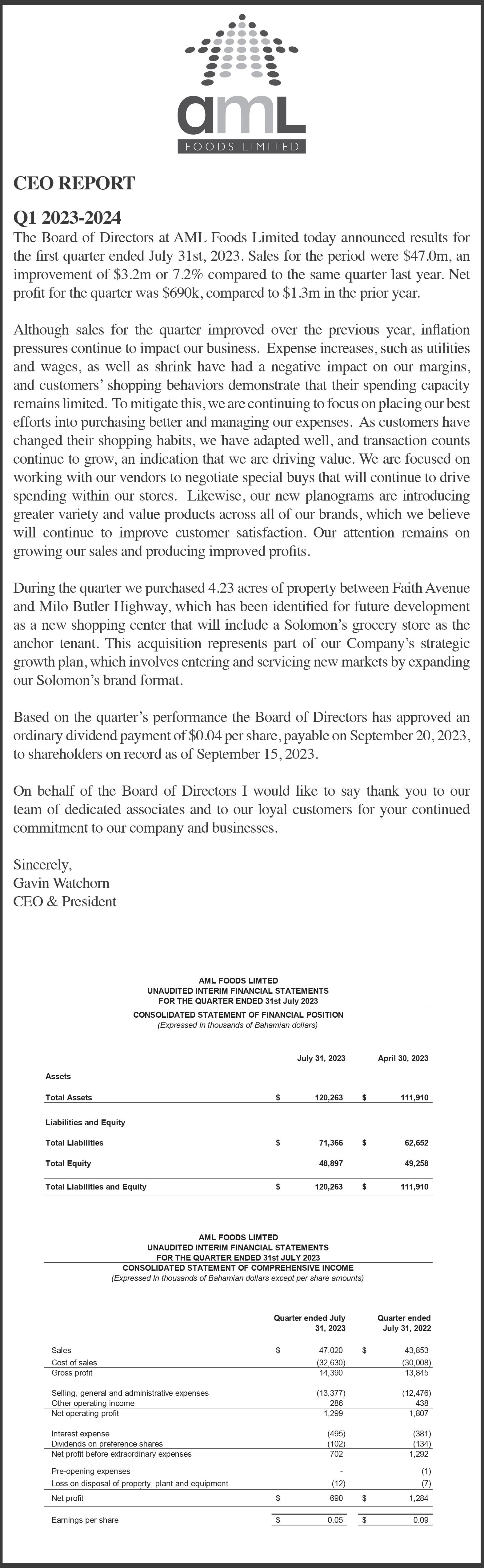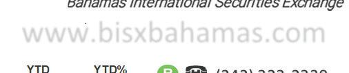 WEDNESDAY, 13 SEPTEMBER 2023 CLOSE CHANGE%CHANGEYTDYTD% BISX ALL SHARE INDEX: 2674.790.050.0029.731.12 BISX LISTED & TRADED SECURITIES 52WK HI52WK LOWSECURITY SYMBOLLAST CLOSECLOSECHANGE VOLUMEEPS$DIV$ P/E YIELD 7.004.50 AML Foods Limited AML 4.50 4.500.00 0.2390.170 18.83.78% 43.9540.06 APD Limited APD 41.19 41.190.00 0.9321.260 44.23.06% 2.762.55Benchmark BBL 2.76 2.760.00 0.0000.020 N/M0.72% 2.702.15Bahamas First Holdings Limited BFH 2.15 2.150.00 8,5000.1400.080 15.43.72% 5.742.51Bank of Bahamas BOB 5.30 5.300.00 0.0700.000 N/M0.00% 7.006.30Bahamas Property Fund BPF 7.00 7.000.00 1.7600.000 N/M0.00% 10.618.69Bahamas Waste BWL 9.65 9.650.00 0.3690.260 26.22.69% 4.703.80Cable Bahamas CAB 4.24 4.240.00 -0.4380.000 -9.7 0.00% 12.2110.20Commonwealth Brewery CBB 11.00 11.000.00 0.1400.000 78.60.00% 4.303.10Commonwealth Bank CBL 4.28 4.280.00 0.1840.120 23.32.80% 10.008.50Colina Holdings CHL 10.00 10.000.00 0.4490.220 22.32.20% 16.0010.65CIBC FirstCaribbean Bank CIB 13.30 13.300.00 0.7220.720 18.45.41% 4.302.74Consolidated Water BDRs CWCB 6.07 6.04 (0.03) 0.1020.434 59.27.19% 10.6010.00Doctor's Hospital DHS 10.60 10.600.00 0.4670.060 22.70.57% 11.679.16Emera Incorporated EMAB 9.12 9.210.09 0.6460.328 14.33.56% 3.833.67Famguard FAM 3.78 3.780.00 0.7280.240 5.26.35% 18.2517.00Fidelity Bank (Bahamas) Limited FBB 17.75 17.750.00 5500.8160.540 21.83.04% 4.503.65Focol FCL 4.49 4.490.00 0.2030.120 22.12.67% 12.7211.00Finco FIN 12.30 12.300.00 0.9390.200 13.11.63% 17.3315.50J. S. Johnson JSJ 15.81 15.810.00 0.6310.610 25.13.86% PREFERENCE SHARES 1.001.00Bahamas First Holdings PreferenceBFHP 1.00 1.000.00 0.0000.000 0.0000.00% 1.001.00Colina Holdings Class A CHLA 1.00 1.000.00 0.0000.000 0.0006.25% 10.0010.00Fidelity Bank Bahamas Class A FBBA 10.0010.000.00 0.0000.000 0.0007.00% 1.001.00Focol Class B FCLB 1.00 1.000.00 0.0000.000 0.0006.50% CORPORATE DEBT - (percentage pricing) 52WK HI52WK LOWSECURITY SYMBOLLAST SALECLOSECHANGEVOLUME 100.00100.00Fidelity Bank (Note 22 Series B+)FBB22 100.00100.000.00 100.00100.00Bahamas First Holdings LimitedBFHB 100.00100.000.00 BAHAMAS GOVERNMENT STOCK - (percentage pricing) 115.92104.79Bahamas Note 6.95 (2029) BAH29 107.31107.310.00 100.00100.00BGS: 2014-12-7Y BG0107 100.00100.000.00 100.00100.00BGS: 2015-1-7Y BG0207 100.00100.000.00 100.00100.00BGS: 2014-12-30Y BG0130 100.00100.000.00 100.00100.00BGS: 2015-1-30Y BG0230 100.00100.000.00 100.00100.00BGS: 2015-6-7Y BG0307 100.00100.000.00 100.00100.00BGS: 2015-6-30Y BG0330 100.00100.000.00 100.00100.00BGS: 2015-10-7Y BG0407 100.00100.000.00 94.8093.94BGRS FX BGR134140 BSBGR1341407 94.7694.760.00 94.9494.94BGRS FX BGR118037 10/13/2037BSBGR1180375 100.00100.000.00 92.6392.63BGRS FX BGR124238 07/13/2038BSBGR1242381 93.3293.320.00 89.4289.42BGRS FX BGR129249 04/15/2049BSBGR1292493 89.4289.420.00 90.9890.60BGRS FX BGR132249 10/15/2049BSBGR1322498 90.8990.890.00 96.6196.61BGRS FX BGR138240 BSBGR1380405 96.1096.100.00 98.8098.80BGRS FX BGR142251 BSBGR1420516 99.8799.870.00 100.78100.78BGRS FL BGRS81035 07/26/2035BSBGRS810359 100.78100.780.00 100.81100.81BGRS FL BGRS81037 07/26/2037BSBGRS810375 100.81100.810.00 97.3497.34BGRS FX BGR112036 10/13/2036BSBGR1120363 97.1597.150.00 100.14100.14BGRS FL BGRS89030 10/19/2030BSBGRS890302 100.14100.140.00 100.03100.03BGRS FL BGRS84033 09/22/2033BSBGRS840331 100.03100.030.00 100.23100.23BGRS FL BGRS77026 05/04/2026BSBGRS770264 100.23100.230.00 100.51100.30BGRS FL BGRS88028 07/26/2028BSBGRS880287 100.36100.360.00 100.65100.65BGRS FL BGRS75025 09/07/2025BSBGRS750258 100.65100.650.00 MUTUAL FUNDS 52WK HI52WK LOW NAV YTD%12 MTH% 2.642.11 2.641.95%3.87% 5.003.30 5.002.16%3.79% 2.291.68 2.301.36%2.85% 192.48116.70 192.486.85%8.83% 199.29199.29 CFAL Global Fixed Income Fund 199.291.07%N/A 30-Jun-2023 1.801.74 1.801.47%2.82% 2.051.84 2.053.58%7.12% 1.911.83 1.911.46%2.87% 0.980.93 0.960.59%-0.60% 10.206.41 10.230.48%8.25% 13.517.62 13.54-0.50%13.68% 7.805.66 7.821.08%3.07% 16.648.65 13.452.47%-6.88% 12.8410.54 12.241.49%0.87% 10.779.57 10.690.71%0.53% 16.279.88 N/AN/AN/A 11.228.45 9.193.00%25.60% 14.8911.20 14.10N/A N/A MARKET TERMS BISX ALL SHARE INDEX 19 Dec 02 = 1,000.00 YIELD - last 12 month dividends divided by closing price 52wk-Hi Highest closing price in last 52 weeks Bid $ Buying price of Colina and Fidelity 52wk-Low - Lowest closing price in last 52 weeks Ask $ Selling price of Colina and fidelity Previous Close - Previous day's weighted price for daily volume Last Price - Last traded over-the-counter price Today's Close - Current day's weighted price for daily volume Weekly Vol. - Trading volume of the prior week Change - Change in closing price from day to day EPS $ - A company's reported earnings per share for the last 12 mths Daily Vol. - Number of total shares traded today NAV - Net Asset Value DIV $ Dividends per share paid in the last 12 months N/M - Not Meaningful P/E - Closing price divided by the last 12 month earnings TO TRADE CALL: CFAL 242-502-7010 | ROYALFIDELITY 242-356-7764 | CORALISLE 242-502-7525 | LENO 242-396-3225 | BENCHMARK 242-326-7333 Coralisle Bahamas Fund - Class D Coralisle Bahamas Fund - Class E Coralisle Bahamas Fund - Class F CFAL Global Equity Fund Leno Financial Conservative Fund Leno Financial Aggressive Fund Leno Financial Balanced Fund Leno Financial Global Bond Fund RF Bahamas Opportunities Fund - Secured Balanced Fund RF Bahamas Opportunities Fund - Targeted Equity Fund RF Bahamas Opportunities Fund - Prime Income Fund RF Bahamas International Investment Fund Limited - Equities Sub Fund RF Bahamas International Investment Fund Limited - High Yield Income Fund RF Bahamas International Investment Fund Limited - Alternative Strategies Fund INTEREST Prime + 1.75%