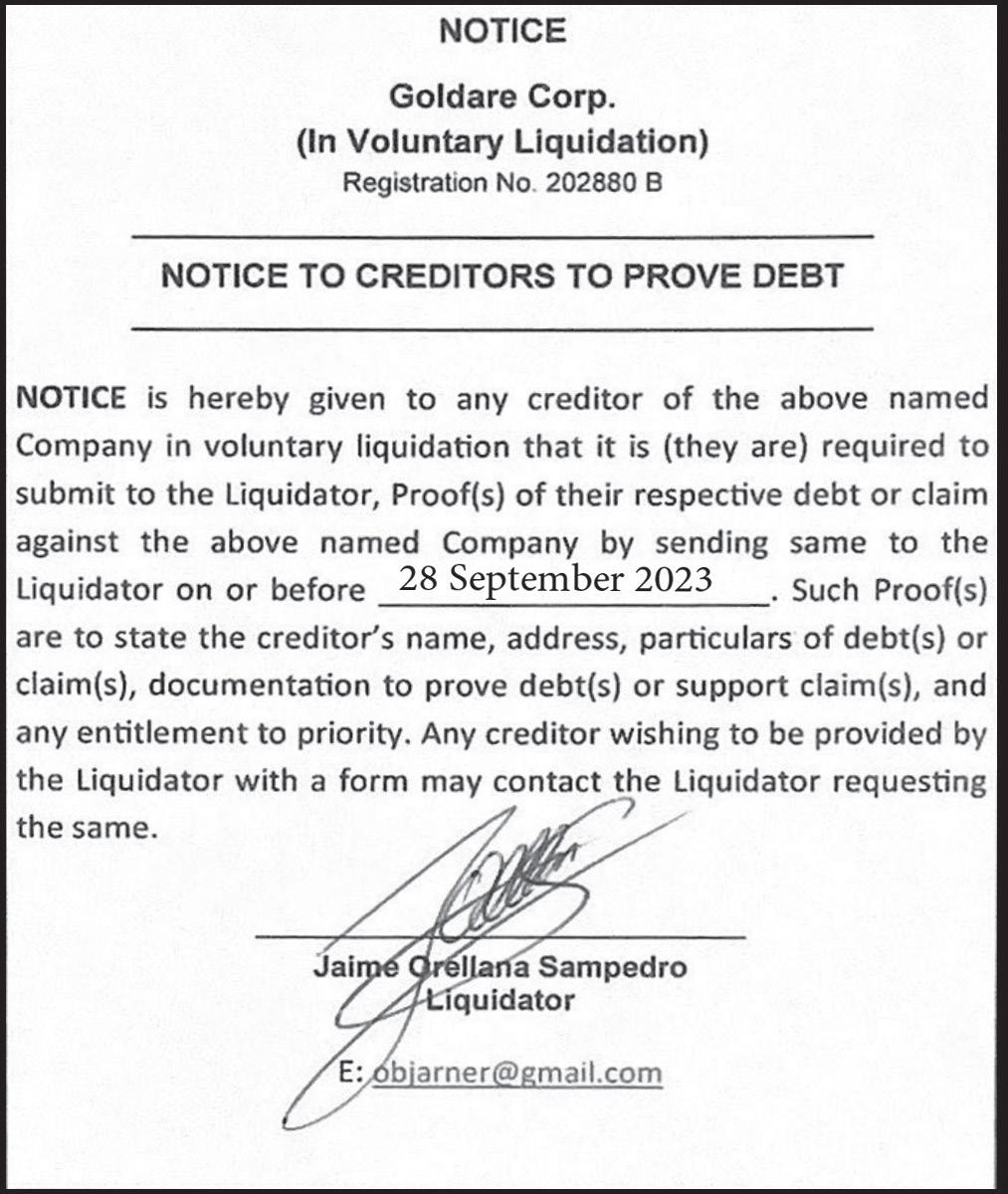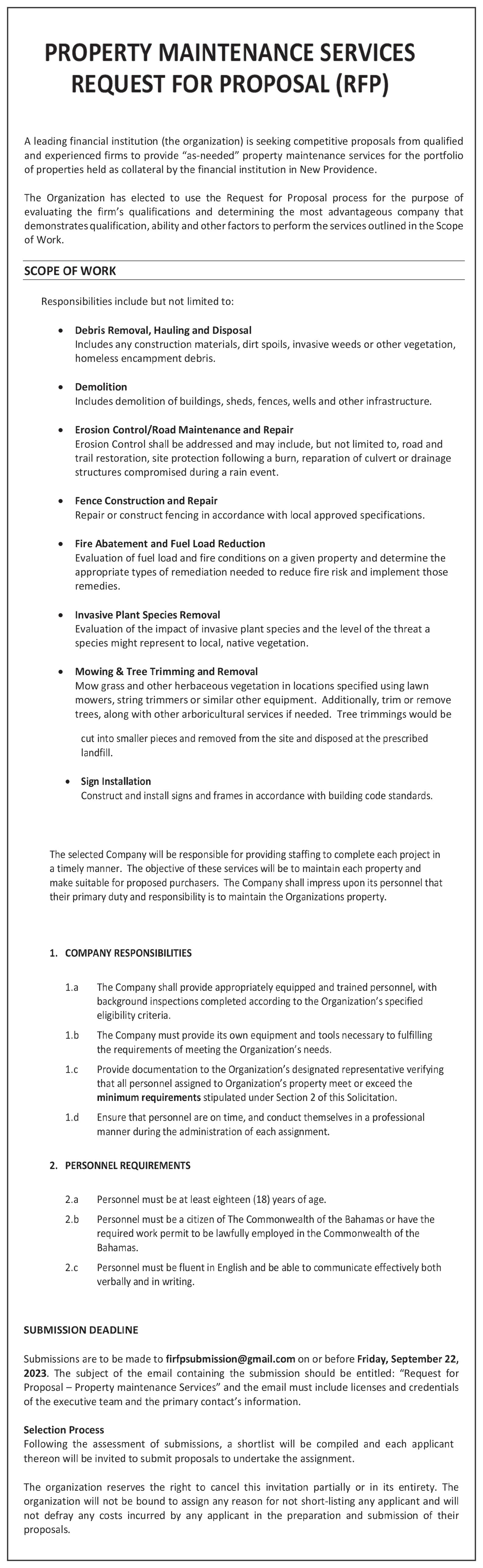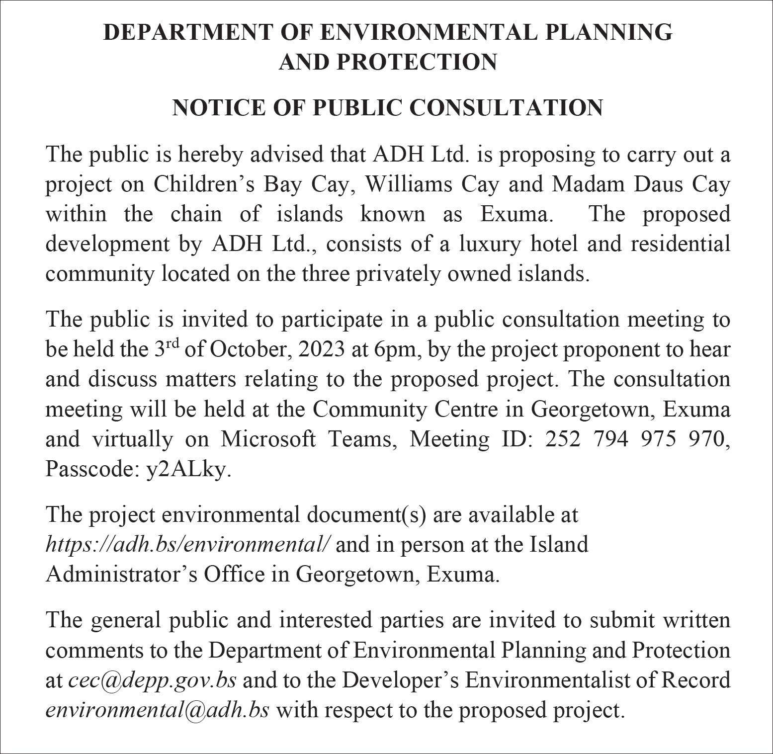 NOTICE is hereby given that FLORE JULNA LORISTON VIL of Garden Hills, New Providence, The Bahamas is applying to the Minister responsible for Nationality and Citizenship, for registration/naturalization as a citizen of The Bahamas, and that any person who knows any reason why registration/ naturalization should not be granted, should send a written and signed statement of the facts within twenty-eight days from the 14th day of September, 2023 to the Minister responsible for nationality and Citizenship, P.O. Box N-7147, Nassau, Bahamas.