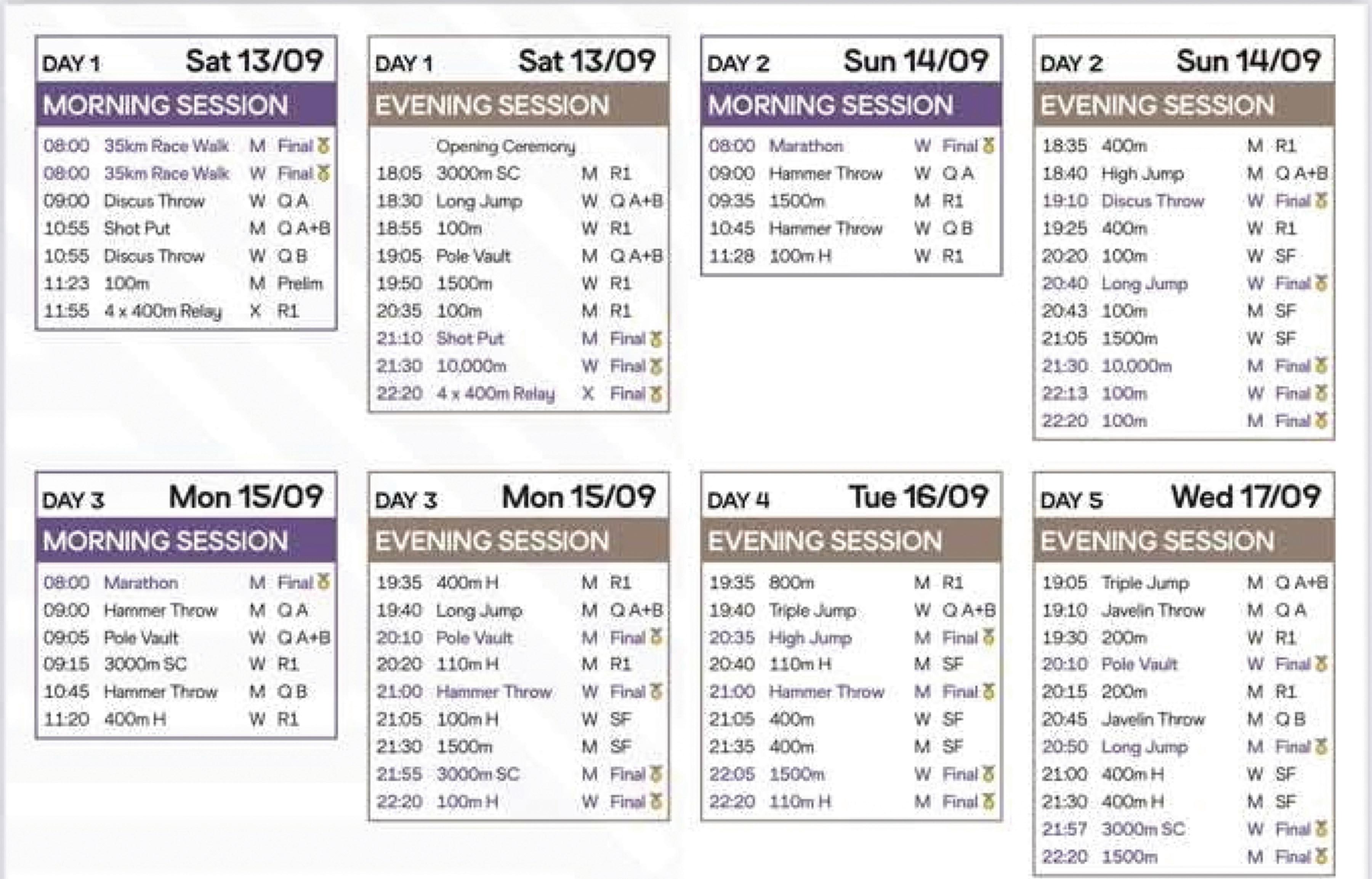 Wednesday Men’s Triple jump qualification at 7:05pm (6:05am EST). Kaiwan Culmer - no start list available yet. Men’s Javelin throw qualification at 7:10pm (6:10am EST).