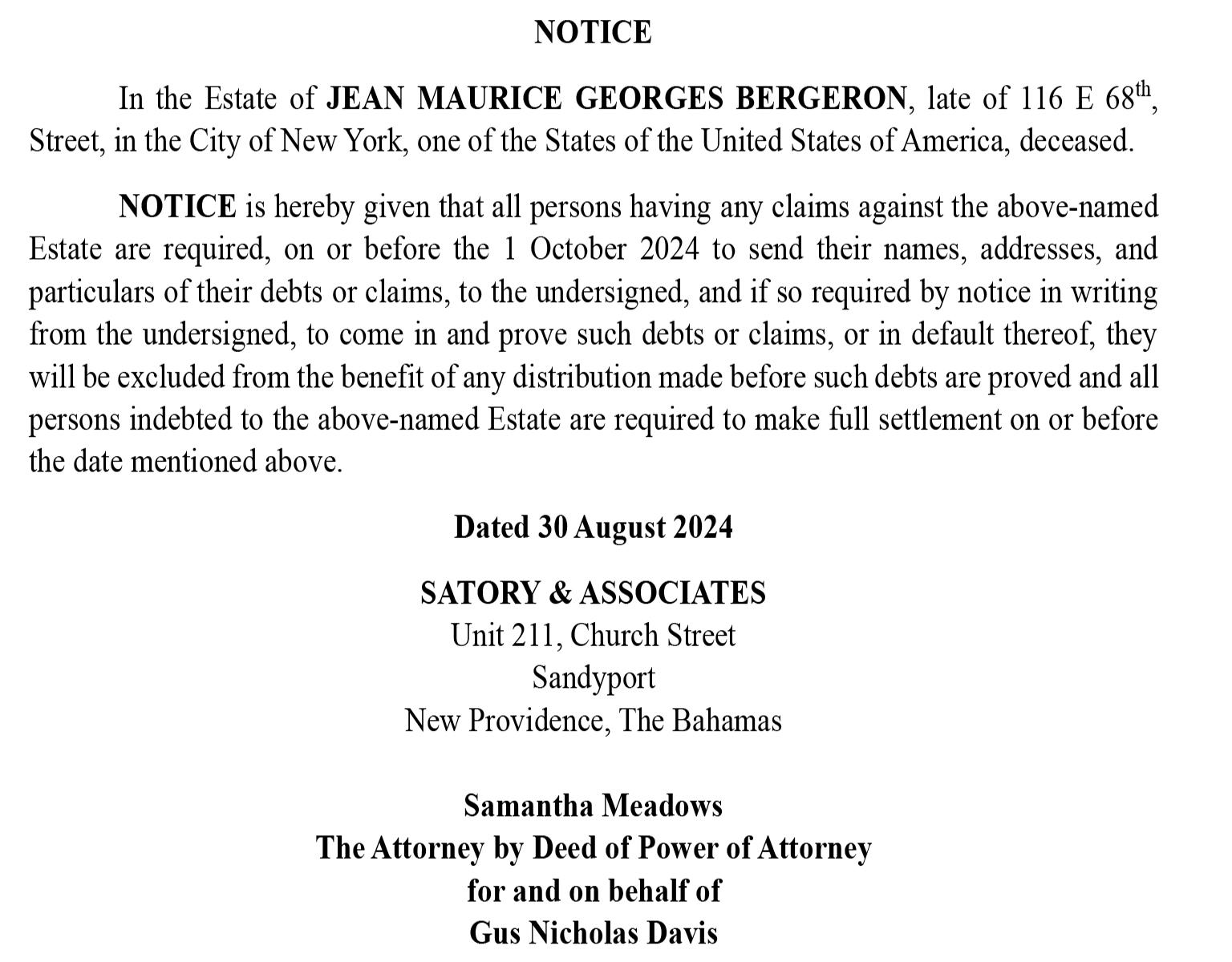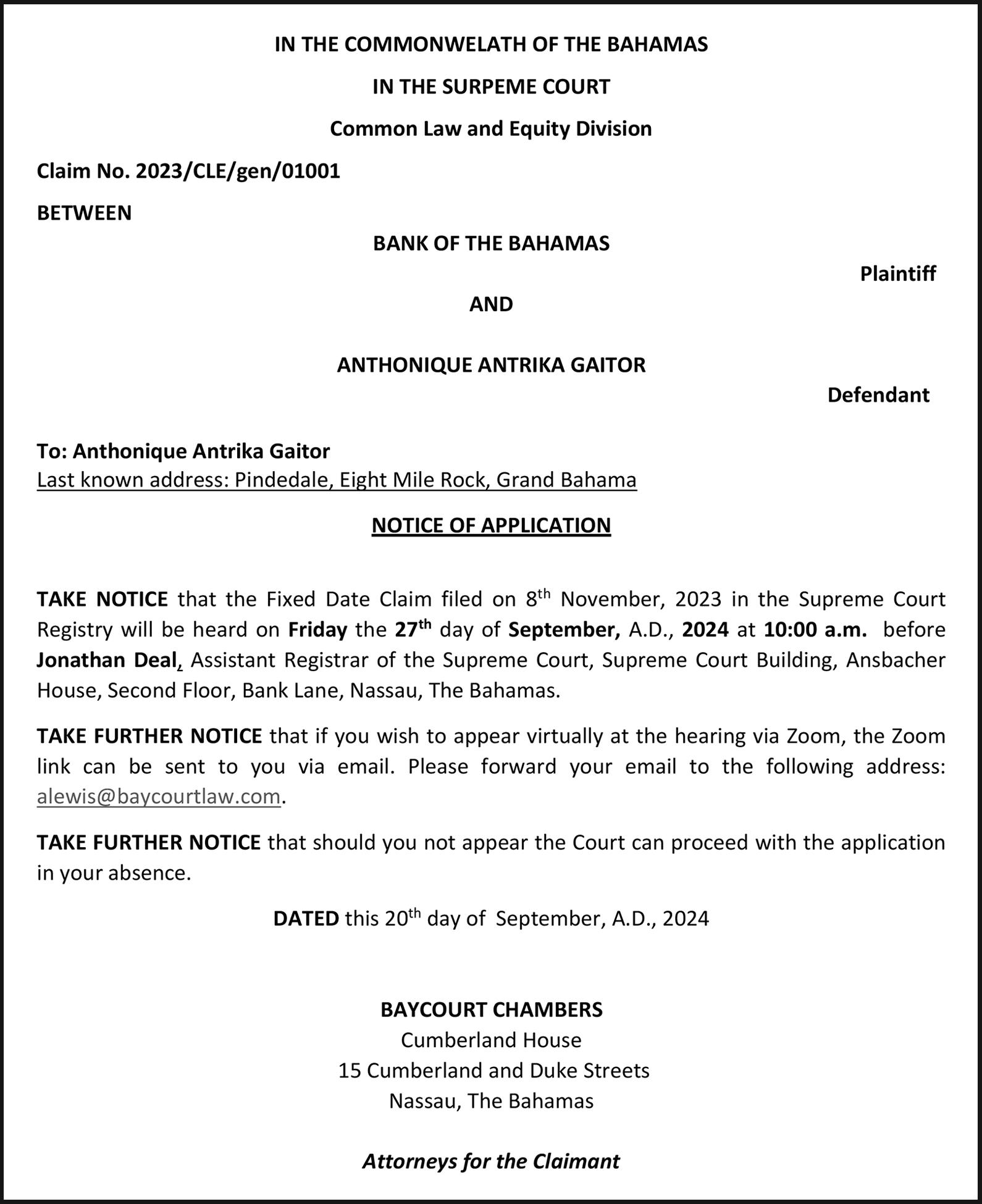 NOTICE is hereby given that GERLIN LEONCE of Governor’s Harbour, General Delivery, Eleuthera, Bahamas, is applying to the Minister responsible for Nationality and Citizenship, for registration/naturalization as a citizen of The Bahamas and that any person who knows any reason why registration/naturalization should not be granted, should send a written and signed statement of the facts within twenty-eight days from the 20th day of September, 2024 to the Minister responsible for nationality and Citizenship, P.O. Box N-7147, Nassau, Bahamas.