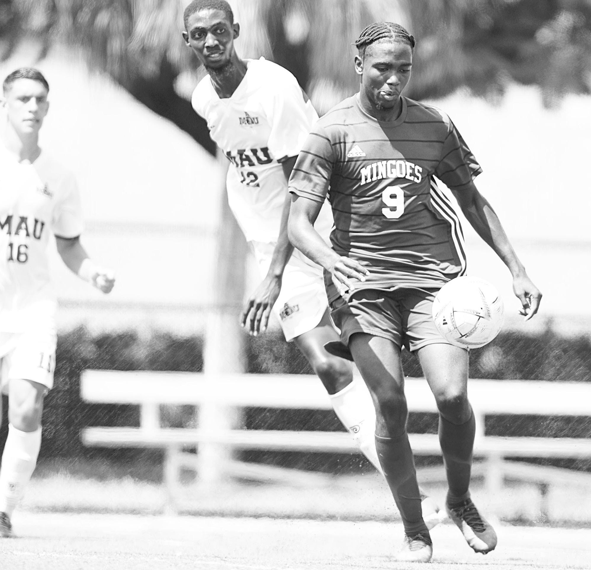 UNIVERSITY of The Bahamas midfielder Peter Julmis (blue 9) dribbles the ball from midfield enroute to a goal for The Mingoes against Millenia Atlantic University yesterday at Doral Meadow Park in Doral Florida. The Mingoes lost the match 5-1.