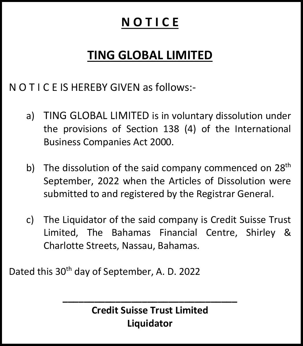 NOTICE is hereby given that DIENORD BIEN-AIME of P. O. Box CR-55415, Malcolm Road, New Providence, Bahamas is applying to the Minister responsible for Nationality and Citizenship, for registration/ naturalization as a citizen of The Bahamas, and that any person who knows any reason why registration/naturalization should not be granted, should send a written and signed statement of the facts within twenty-eight days from the 22nd day of September, 2022 to the Minister responsible for nationality and Citizenship, P.O. Box N-7147, Nassau, Bahamas.