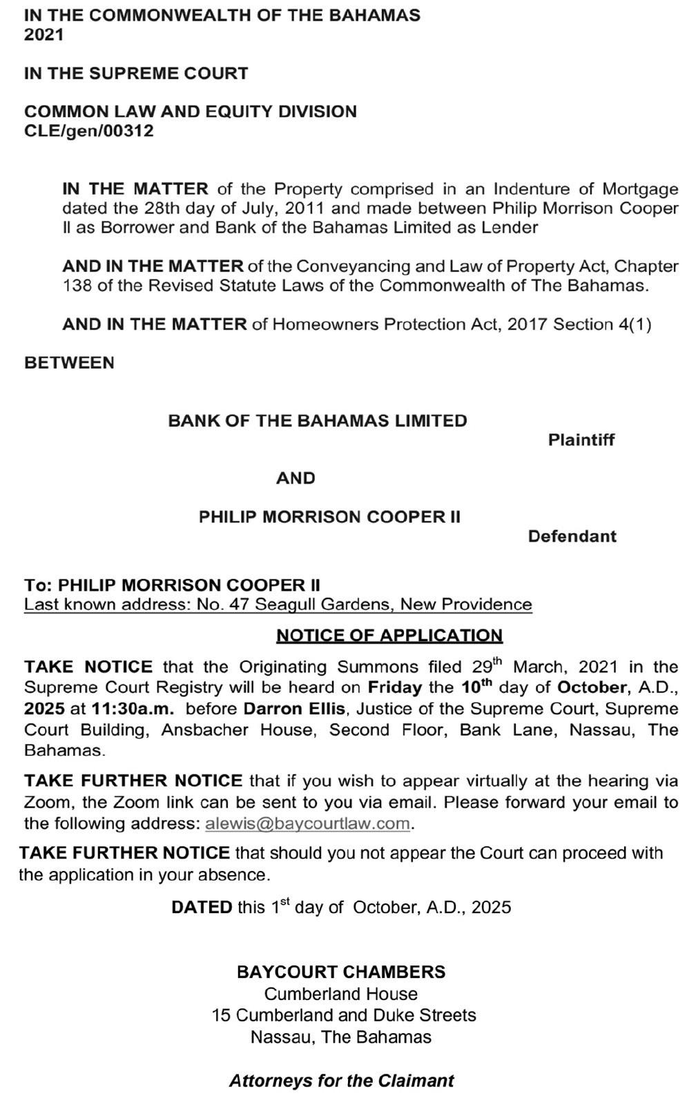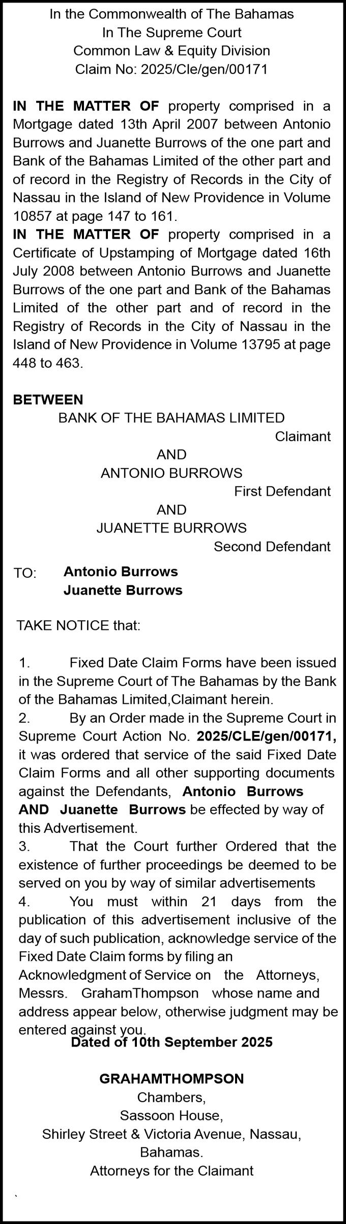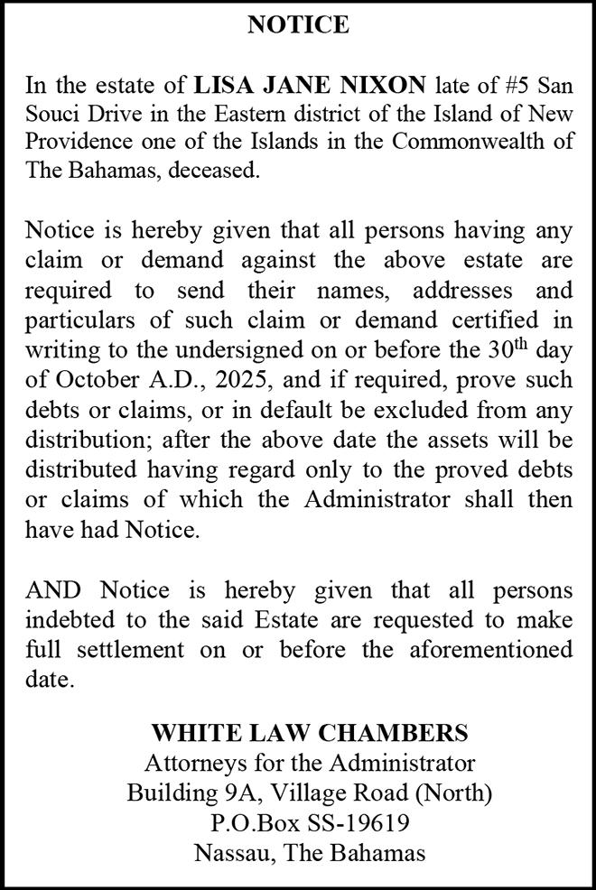 NOTICE is hereby given that TELIZIER NICOLAS of P.O. Box GT2381, Cowpen Road, Nassau, The Bahamas, is applying to the Minister responsible for Nationality and Citizenship, for Registration/ Naturalization as a citizen of The Bahamas, and that any person who knows any reason why registration/naturalization should not be granted, should send a written and signed statement of the facts within twentyeight days from the 25th day of September 2025 to the Minister responsible for nationality and Citizenship, P.O. Box N-7147, Nassau, New Providence, The Bahamas.
