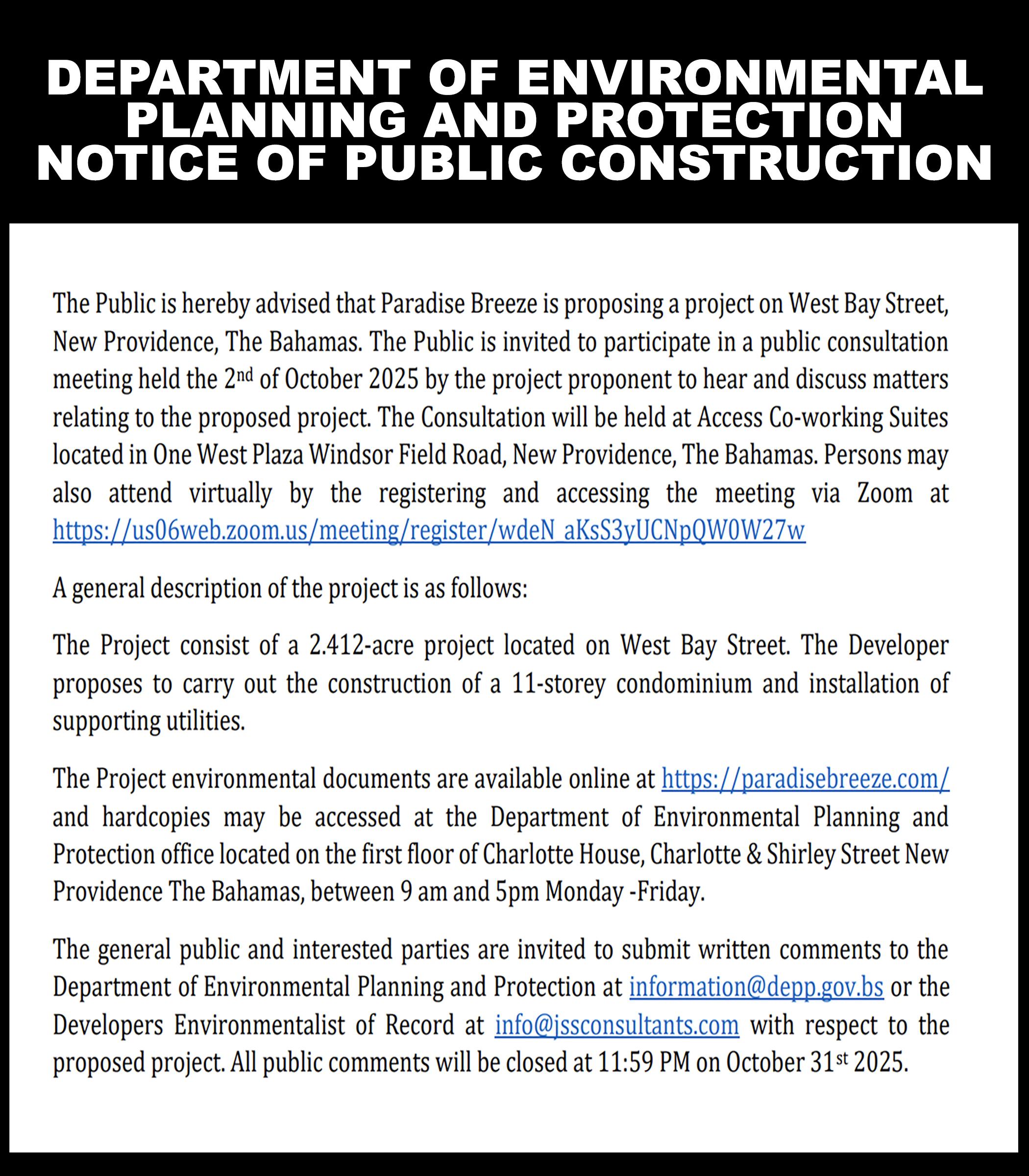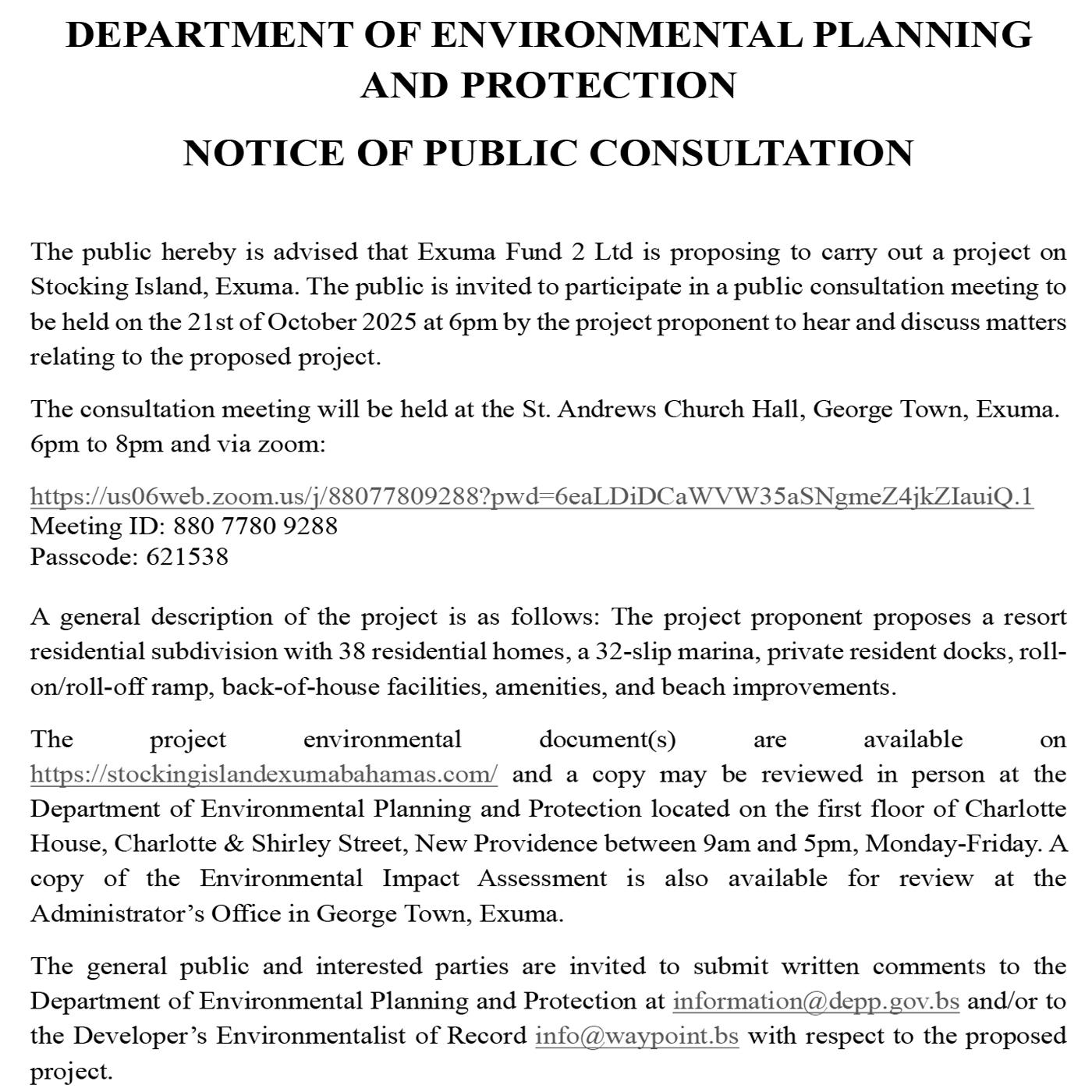 The EIA, produced by Bahamian consultants Waypoint Consulting, added: “The proposed development is a resort residential subdivision complete with up to 38 residential homes, a 32-slip marina, private resident docks, moorings, back-of-house facilities, associated amenities and beach improvements. Backof-house operations will service waste management, electricity and potable water facilities.