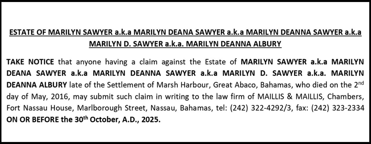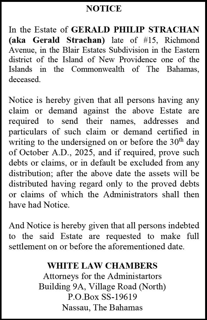 NOTICE is hereby given that GERELINE MARTIN of Jones Town, Eight Mile Rock, Grand Bahama, The Bahamas, is applying to the Minister responsible for Nationality and Citizenship, for Registration/ Naturalization as a citizen of The Bahamas, and that any person who knows any reason why registration/naturalization should not be granted, should send a written and signed statement of the facts within twentyeight days from the 25th day of September 2025 to the Minister responsible for nationality and Citizenship, P.O. Box N-7147, Nassau, New Providence, The Bahamas.