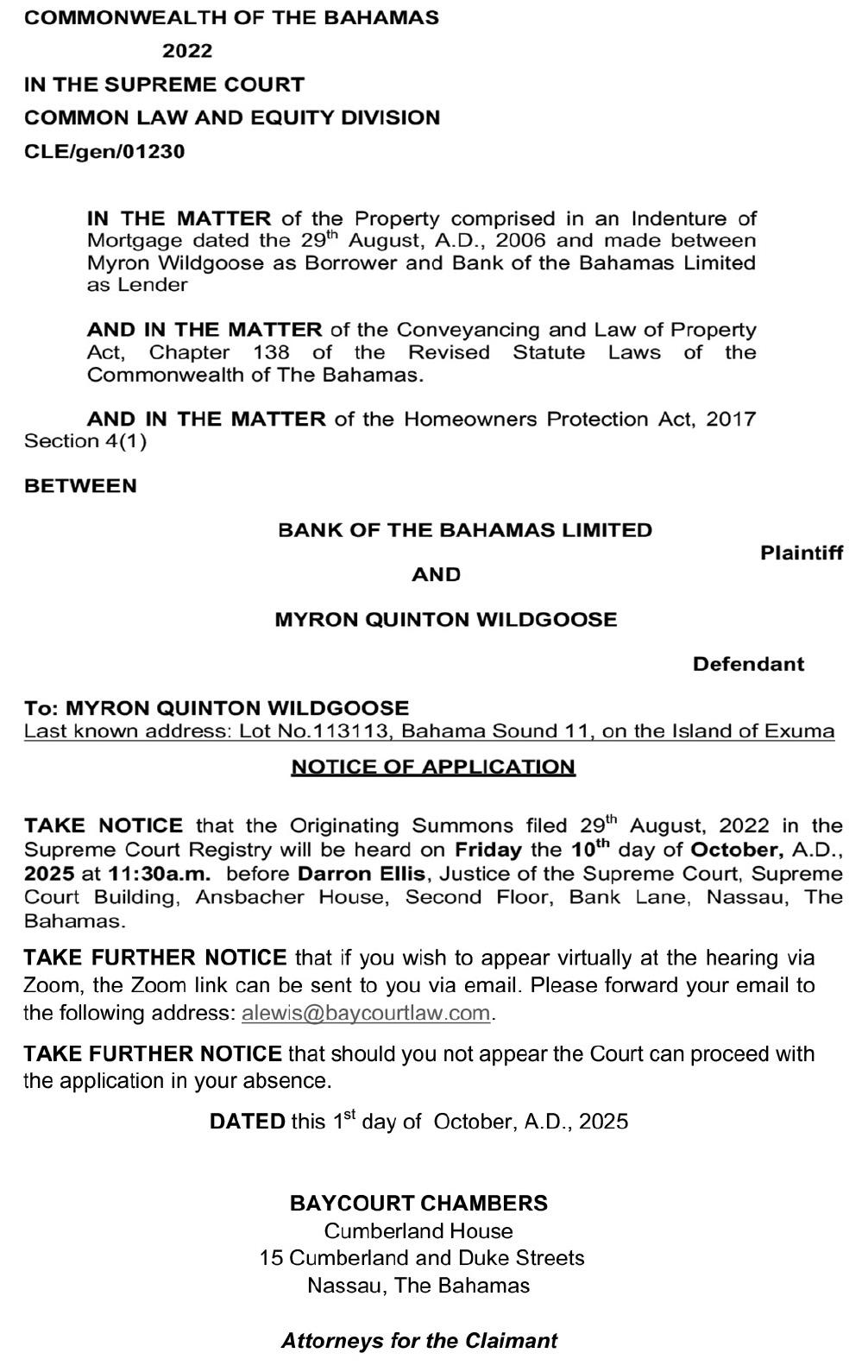NOTICE is hereby given that TAWANANYASHA E MUSHONGA of #5 Edgecombe Terrace, Nassau, The Bahamas, is applying to the Minister responsible for Nationality and Citizenship, for Registration/ Naturalization as a citizen of The Bahamas, and that any person who knows any reason why registration/naturalization should not be granted, should send a written and signed statement of the facts within twentyeight days from the 25th day of September 2025 to the Minister responsible for nationality and Citizenship, P.O. Box N-7147, Nassau, New Providence, The Bahamas.