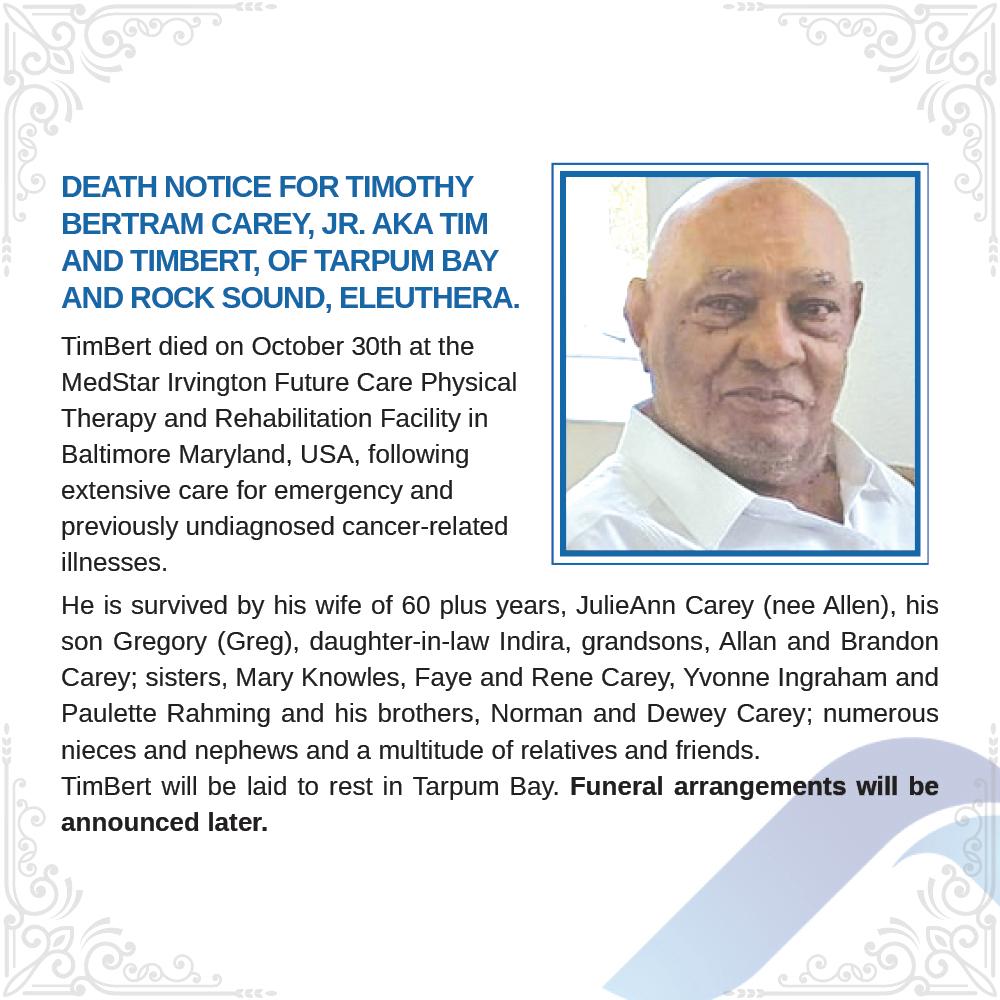 of Mantol Street, Montell Heights, who died at the Princess Margaret Hospital on Wednesday, October 15th, 2025, will be held at God’s Temple of Praise, Taylor Street, Nassau Village, on Saturday, 8th November, 2025 at 11:00 a.m. Suffragan Bishop Ezekiel Munnings, assisted by other Ministers of the Gospel will officiate. Interment will follow in Old Trail Cemetery, Abundant Life Road.
