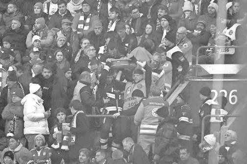POLICE officers and paramedics carry a stretcher down the stands during a medical emergency during the Champions League opening phase soccer match between Bayern Munich and SL