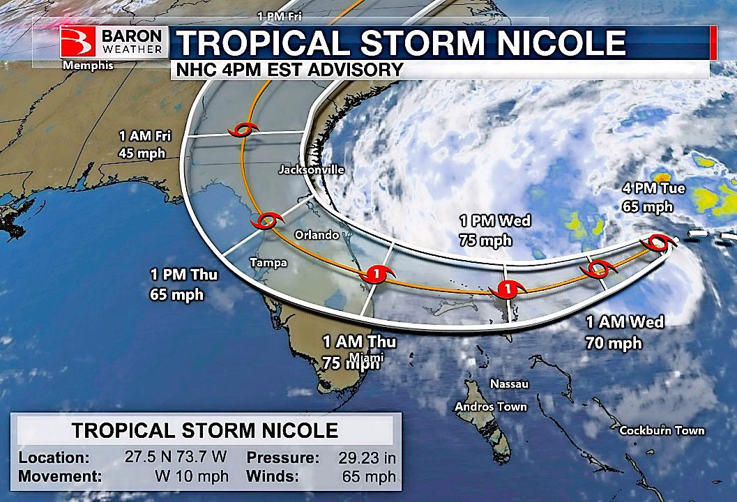 Yesterday, Tropical Storm Nicole was heading west with 60 mph winds, on a projected path to impact the northwest Bahamas, according to Captain Rus sell. He said Nicole was now at the “warning” stage, noting that communities could be impacted within 36 hours.