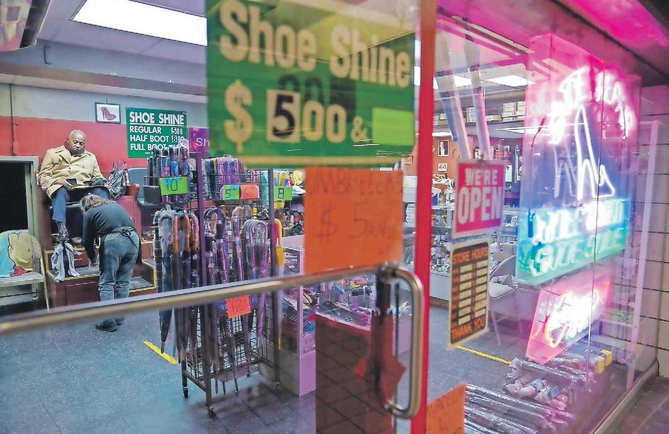 A CUSTOMER sits for a shoe shine at a shoe repair shop on Feb. 3, 2023, in New York.
