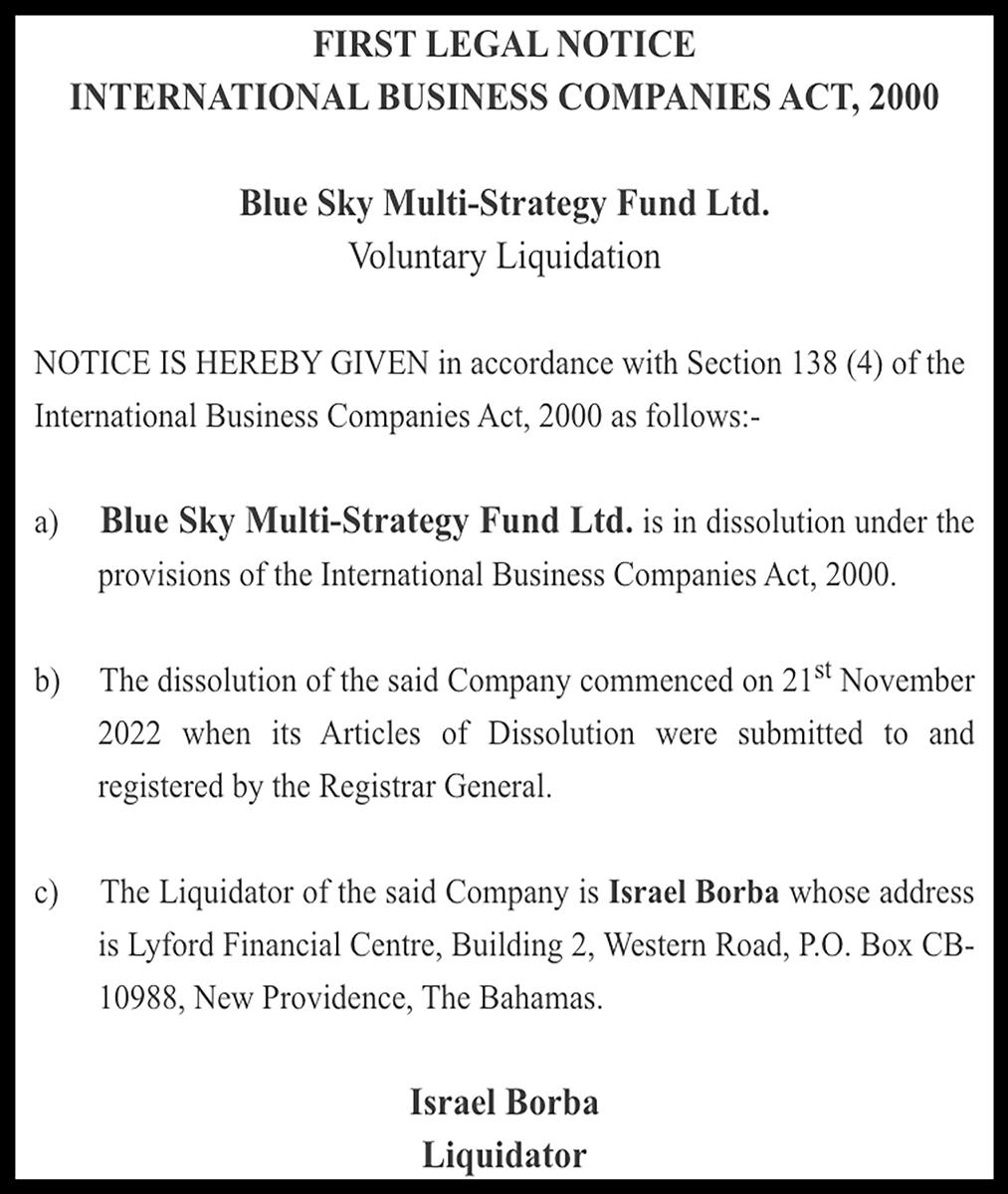 MARKET TERMS BISX ALL SHARE INDEX - 19 Dec 02 = 1,000.00 YIELD - last 12 month dividends divided by closing price 52wk-Hi - Highest closing price in last 52 weeks Bid $ - Buying price of Colina and Fidelity 52wk-Low - Lowest closing price in last 52 weeks Ask $ - Selling price of Colina and fidelity Previous Close - Previous day's weighted price for daily volume Last Price - Last traded over-the-counter price Today's Close - Current day's weighted price for daily volume Weekly Vol. - Trading volume of the prior week Change - Change in closing price from day to day EPS $ - A company's reported earnings per share for the last 12 mths Daily Vol. - Number of total shares traded today NAV - Net Asset Value DIV $ - Dividends per share paid in the last 12 months N/M - Not Meaningful P/E - Closing price divided by the last 12 month earnings TO TRADE CALL: CFAL 242-502-7010 | ROYALFIDELITY 242-356-7764 | CORALISLE 242-502-7525 | LENO 242-396-3225 | BENCHMARK 242-326-7333 5.55% 6.35% 4.31% 5.55% 15-Apr-2049 17-Nov-2050 17-Apr-2033 15-Apr-2049 5.06% 5.22% 13-Jul-2038 15-Dec-2037 6.25% 30-Sep-2025 31-Mar-2022 FUND CFAL Bond Fund CFAL Balanced Fund CFAL Money Market Fund CFAL Global Bond Fund 6.25% 4.50% 6.25% 4.25% NAV Date 5.65% 5.69% 5.50% 15-Dec-2021 30-Jul-2022 15-Dec-2044 30-Jul-2045 26-Jun-2022 26-Jun-2045 15-Oct-2022 29-Jul-2022 21-Apr-2050 15-Jan-2049 15-Oct-2049 31-Mar-2021 31-Jan-2022 31-Jan-2022 31-Oct-2022 31-Jan-2022 31-Jan-2022 31-Jan-2022 31-Jan-2022 31-Oct-2022 31-Oct-2022 INTEREST Prime + 1.75% MARKET REPORT 31-Mar-2021 31-Mar-2021 MATURITY 19-Oct-2022 20-Nov-2029 31-Jul-2022 31-Jul-2022 6.95% 4.50% 31-Mar-2022 31-Oct-2022 4.50% 6.25% 5.60% 15-Jul-2049 Colonial Bahamas Fund Class D Colonial Bahamas Fund Class E Colonial Bahamas Fund Class F CFAL Global Equity Fund Leno Financial Conservative Fund Leno Financial Aggressive Fund Leno Financial Balanced Fund Leno Financial Global Bond Fund RF Bahamas Opportunities Fund - Secured Balanced Fund RF Bahamas Opportunities Fund - Targeted Equity Fund RF Bahamas Opportunities Fund - Prime Income Fund RF Bahamas International Investment Fund Limited - Equities Sub Fund RF Bahamas International Investment Fund Limited - High Yield Income Fund RF Bahamas International Investment Fund Limited - Alternative Strategies Fund (242)323-2330 (242) 323-2320 www.bisxbahamas.com