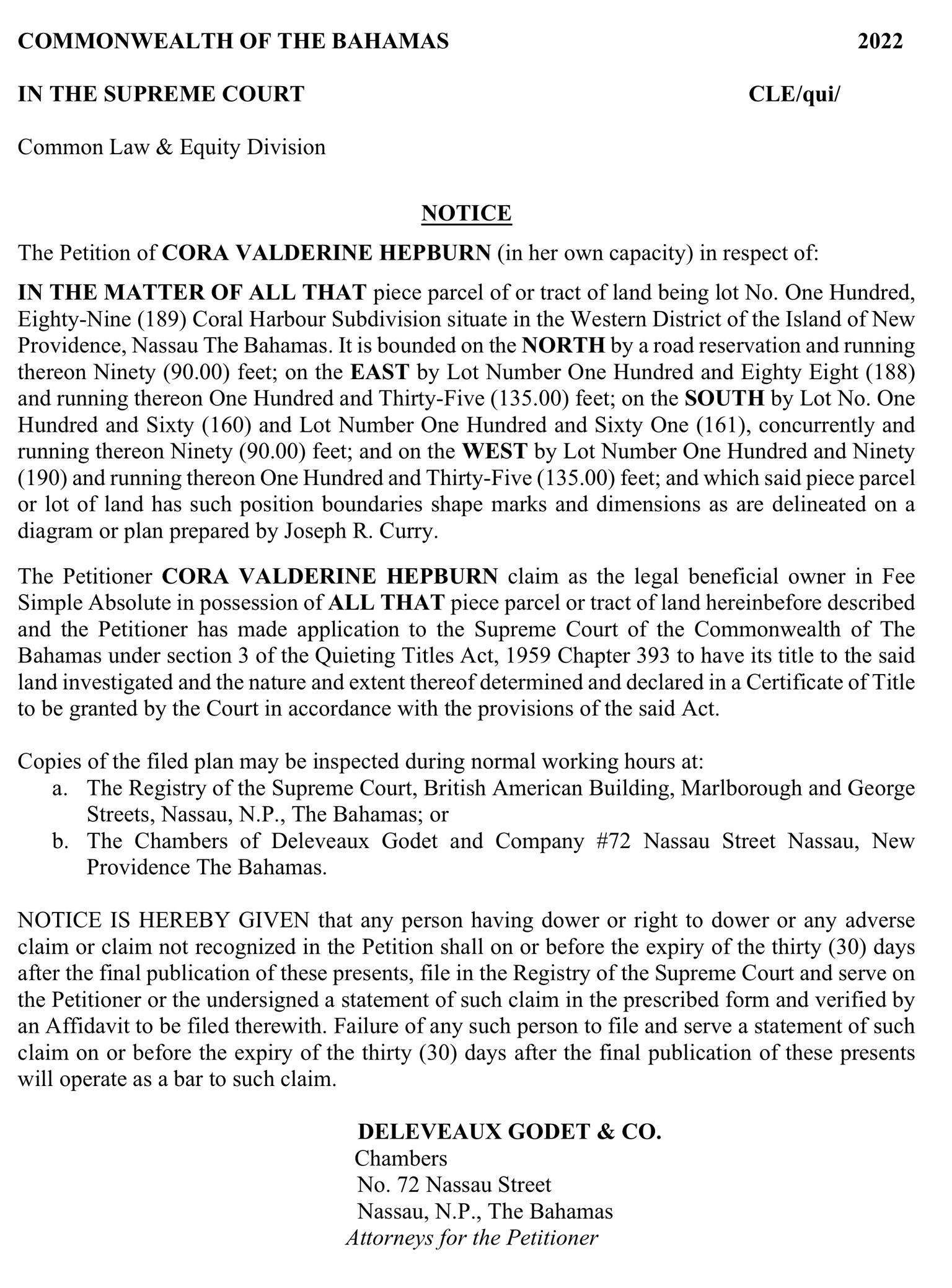 NOTICE is hereby given that CLAISY ORNEUS of Barcardi Road, New Providence, The Bahamas is applying to the Minister responsible for Nationality and Citizenship, for registration/naturalization as a citizen of The Bahamas, and that any person who knows any reason why registration/naturalization should not be granted, should send a written and signed statement of the facts within twenty-eight days from the 17th day of November, 2022 to the Minister responsible for nationality and Citizenship, P.O. Box N-7147, Nassau, Bahamas.