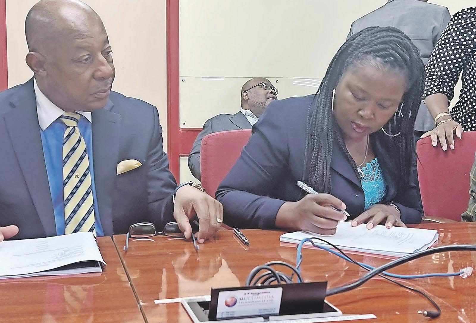 BCPOU president Sherry Benjamin signs yesterday as Bridge Authority chairman Basil Longley watches on.