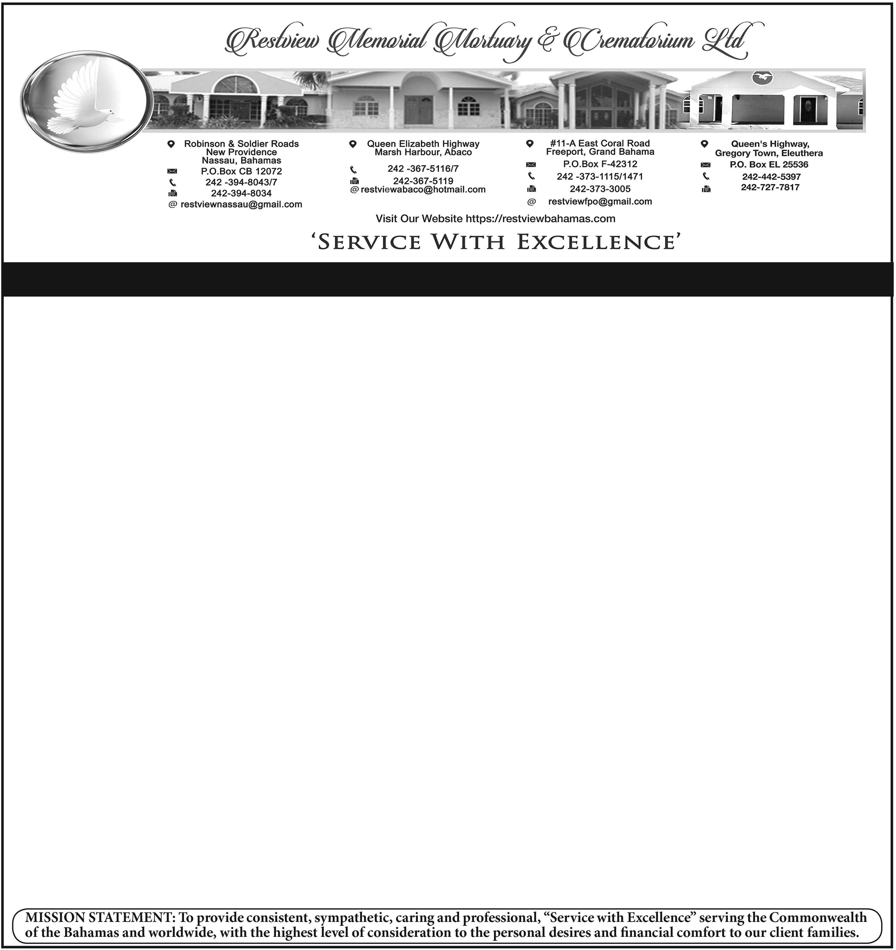 Relatives and friends may pay their respects at Kemp’s Funeeal Home Limited, 19 Palmdale Avenue, Nassau on Friday, 2nd December, 2022 from 12:00 noon to 4:00 p.m.
