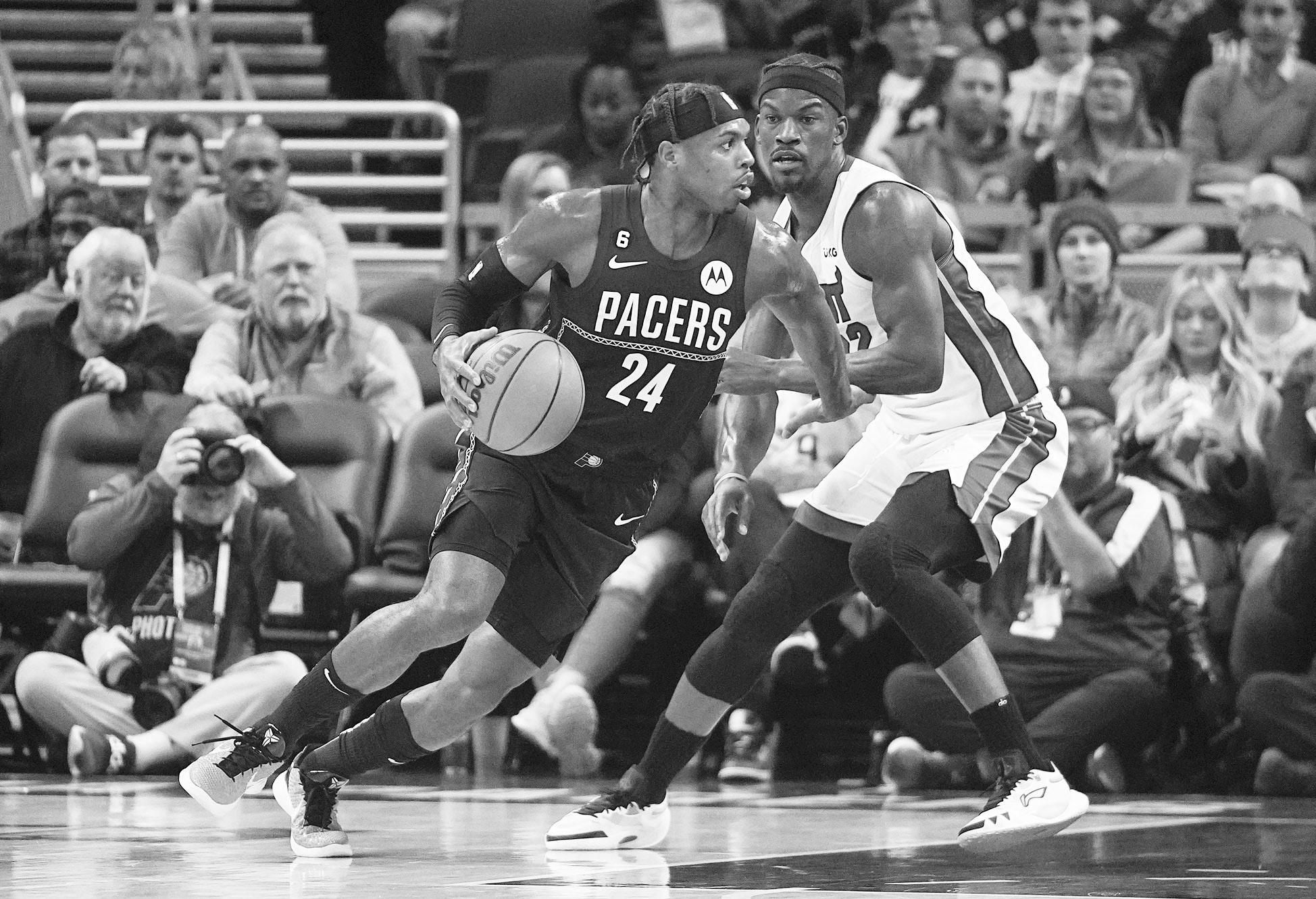 INDIANA Pacers’ Buddy Hield (24) is defended by Miami Heat’s Jimmy Butler, left, during the first half of an NBA basketball game on Monday in Indianapolis. (AP Photo/Darron Cummings)