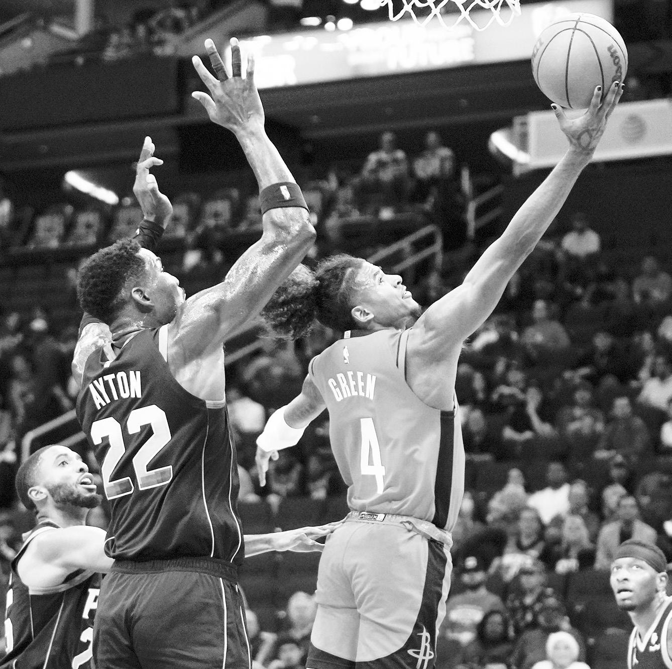 HOUSTON Rockets guard Jalen Green (4) drives to the basket past Phoenix Suns centre Deandre Ayton (22) during the first half last night in Houston. (AP Photo/Eric Christian Smith)