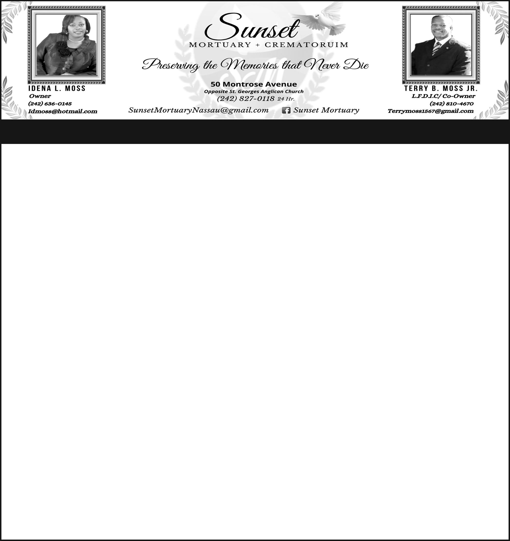 Viewing will be held in the “Celestial Suite” at Restview Memorial Mortuary and Crematorium Limited, #11-A Coral Road, Freeport, Grand Bahama on “TODAY” from 10:00 a.m. to 5:00 p.m.