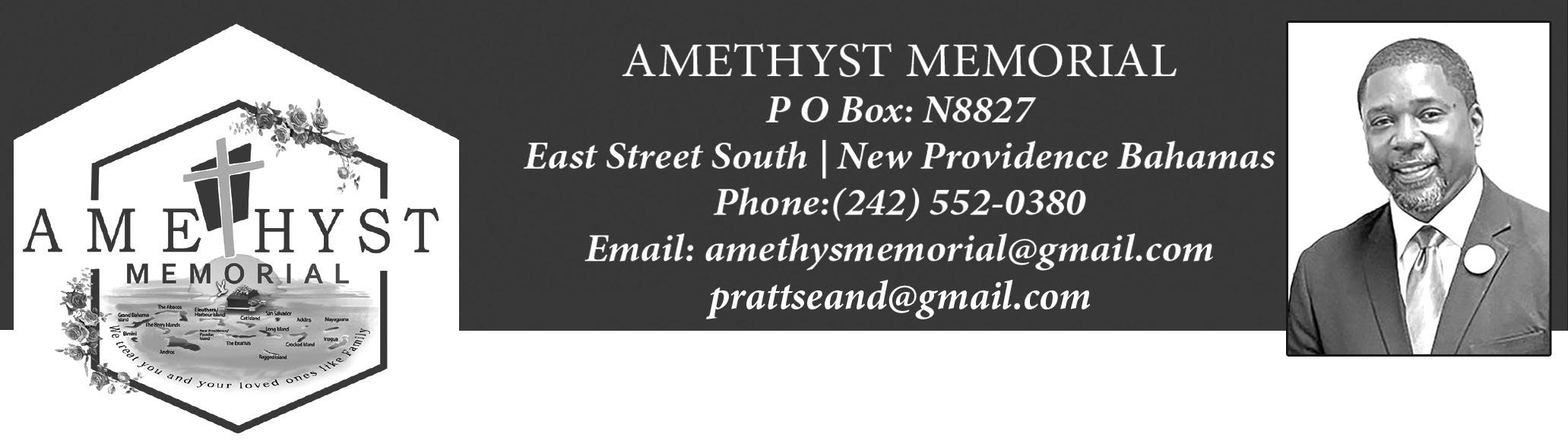 a resident of #44 Seymour Street, Yellow Elder, who died on Monday 28th November 2022, will be held on Sunday 18th December 2022 at 11:00 a.m., at Prayer and Praise Assembly, Ragged Island Street. Officiating will be Bishop Hubert Kemp (Bishop and Pastor of Prayer and Praise Assembly), assisted by The Hon. Pastor Cynthia “Mother” Pratt (Asst. Pastor of Prayer and Praise Assembly). Interment will follow in Lakeview Memorial Gardens & Mausoleums, John F. Kennedy Drive & Gladstone Road.