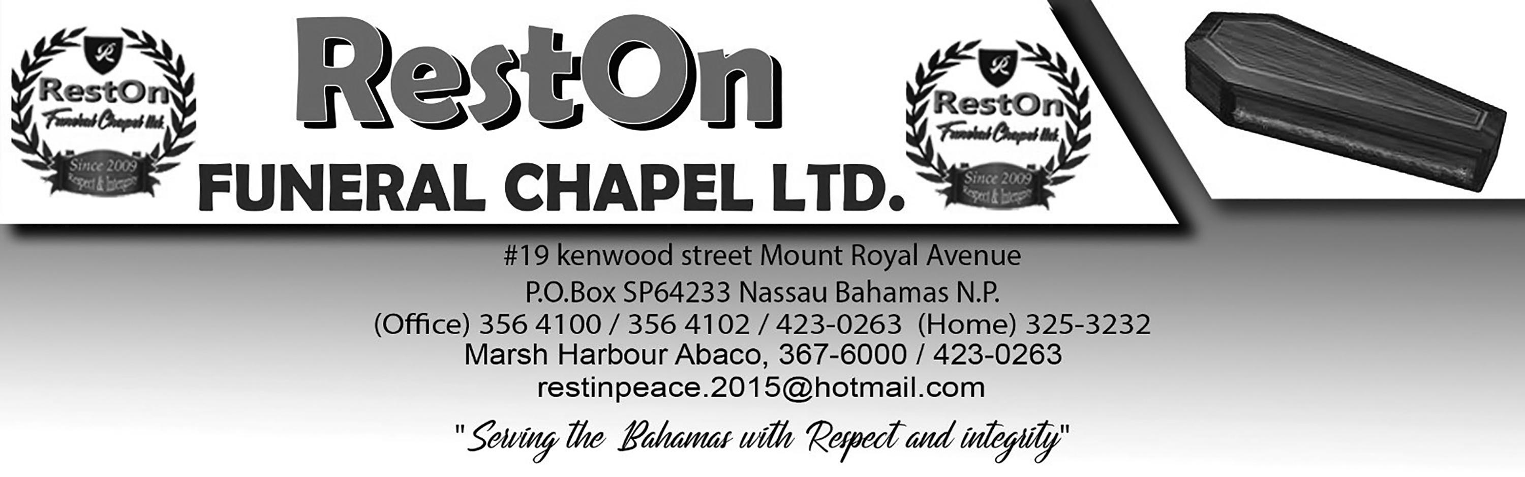 Bridget Gibson’s memory will forever be cherished by her, husband of 53 years: Arthel Gibson; Children: Sharon Turnquest and Dr. Ingrid Gibson-Mobley; Grand Daughters: Ericka and Danielle Turnquest, Jennise Mobley; Grand Son: Jerry Mobley II; Sisters: Eloise Nixon, Winnifred Clarke, Marion Pinder & Rena McKenzie; Brothers: Errol Pinder; Adopted Son: Dwayne Cash; Aunts: Myrtis Nixon & Geneva Pinder; Uncle: George Pinder; Sisters-InLaw: Rev. Thelcene Simms; Sheila Johnson & Velma Ferguson, Curlean Gibson; Brothers-In-Law: Rev. Jonathan Simms, Leonard Johnson and Anthony McKenzie; God Children: Superintendent Michael Thurston; Nieces and Nephews: Sheaddy & Elizabeth Nixon, Sheria Dorsett, Sherene Pinder, Ncolette Bethel, Rev. George & Constance Clarke, Dwight Clarke, Clint & Abby Clarke, Bridgette Clarke, Suzette McKenzie, Jamal McKenzie, Latara & Latera Pinder, Rena & Terrel McKenzie, Joshua Wallac, Maria Pinder-Rolle, Evangelist Janette & Wentwood Gibson, Veronique Nixon-Johnson, Shearwood, Sareno & Shearo Nixon, Feneisha Khadisha & Jerard Harris, Brianna Dorsette, Chakara Pinder, Quentin & Quindon Bethel, Katianna Bethel, Lindsey & Cordero Clarke, Adricka Williamson, Shantia Nabbie, Melissa, Denice, Deno & Dwight Clarke, Jr. Arianna, Amira & Waldaisha Clarke, Clint Clarke Jr, & Garret Clarke Jr. Brenique & Isaiah Johnson,