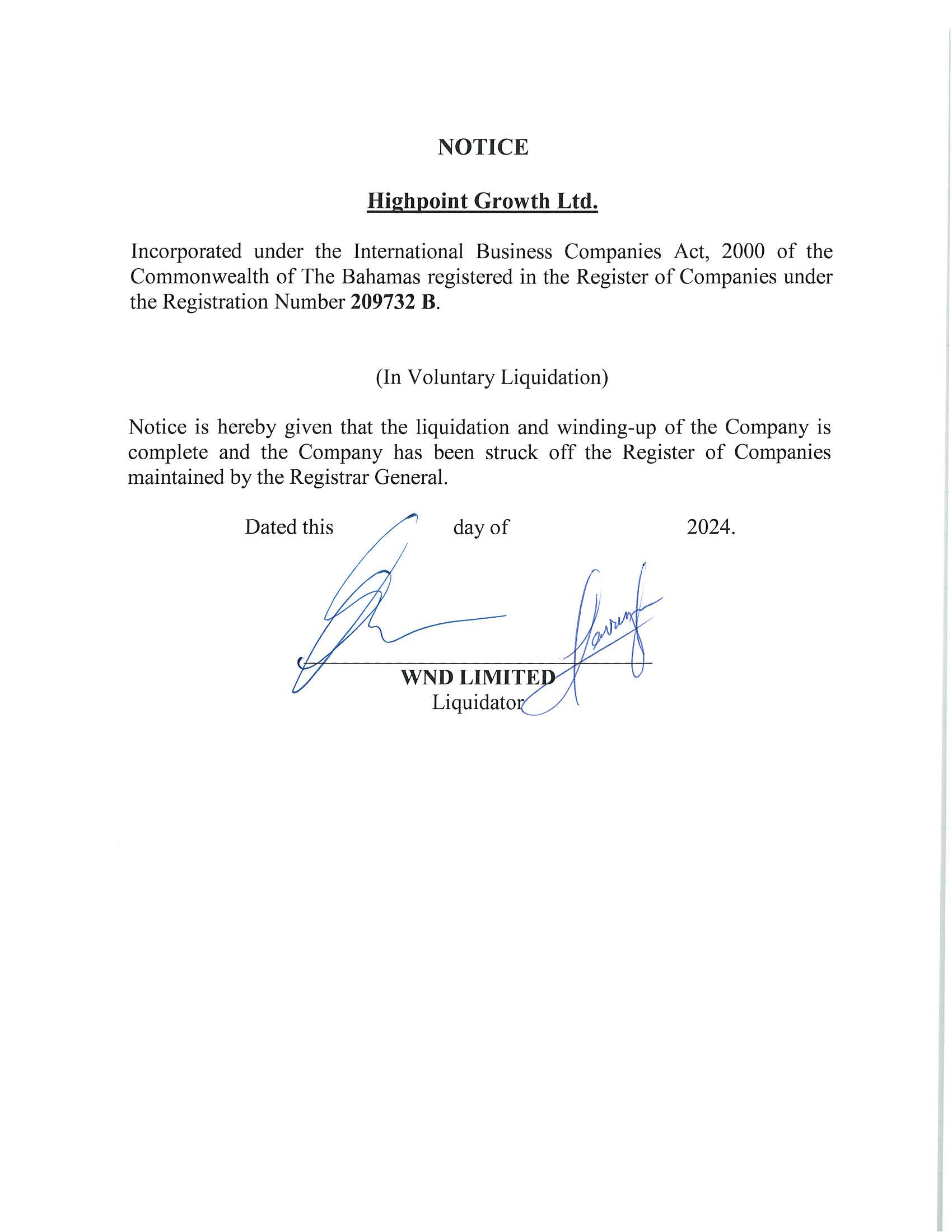 Notice is hereby given that, in accordance with Section 138 (8) of the International Business Companies Act, No.45 of 2000, WIDE WINGS INC. has been completed, a Certificate of Dissolution has been issued and the Company has therefore been struck off the Register. The date of completion of the dissolution was the 30th May, 2024 NOTICE