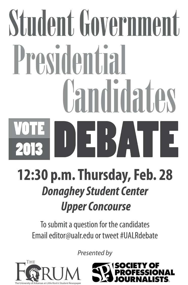 Incumbent President Mohsin and challenger Lauren McNeaill, a junior Spanish and psychology major, will participate in a debate at 12:30 p.m. Thursday, Feb. 28 in the Donaghey Student Center Upper Concourse. Executive and senatorial candidates will have booths set up in the area beginning at noon.