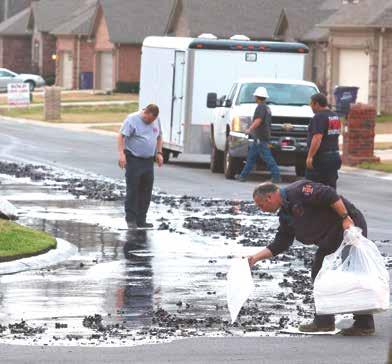 Firefighters drop absorbent cloths on the ground where oil flowed down North Starlite Road in Mayflower’s Northwood subdivision, after crews stopped the flow of oil from a pipeline break March 29. Photo courtesy of Stephen B. Thornton/Arkansas Democrat-Gazette