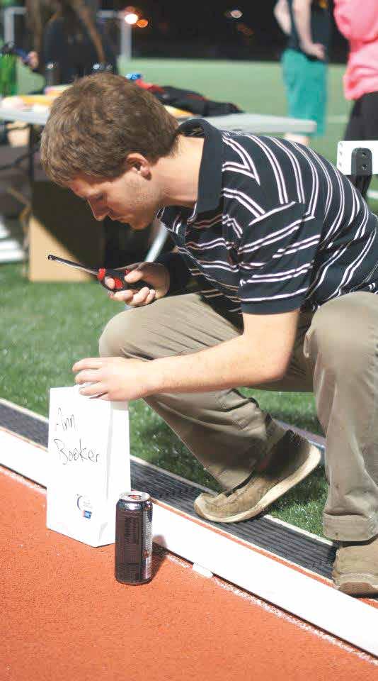 Beau Bienvenu, a senior business management major, lights a luminaria at the Coleman Sports Complex during the second annual UALR Relay for Life on Friday, April 12. The 142 participants on 14 teams raised more than $7,300 on behalf of the American Cancer Society.