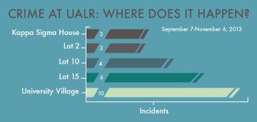 AThe Forum has identified University Village, Lot 15 and Lot 2 as three areas on campus experiencing the most crime over the course of a 10-week period this semester, according to reports filed in the UALR crime database.