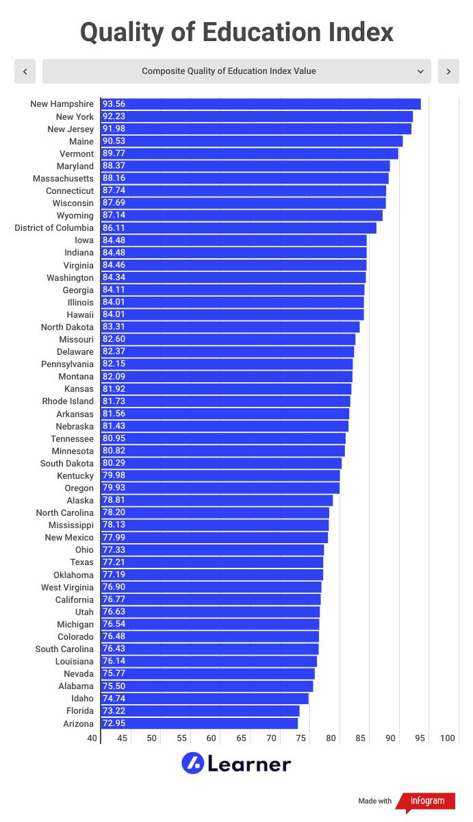 The highest-ranked state was New Hampshire with an overall quality of education index value of 93.56. The lowest-ranked state was Arizona with an overall quality of education index value of 72.95. Arkansas scored 26th overall among the states, with a composite quality of index score of 81.56.