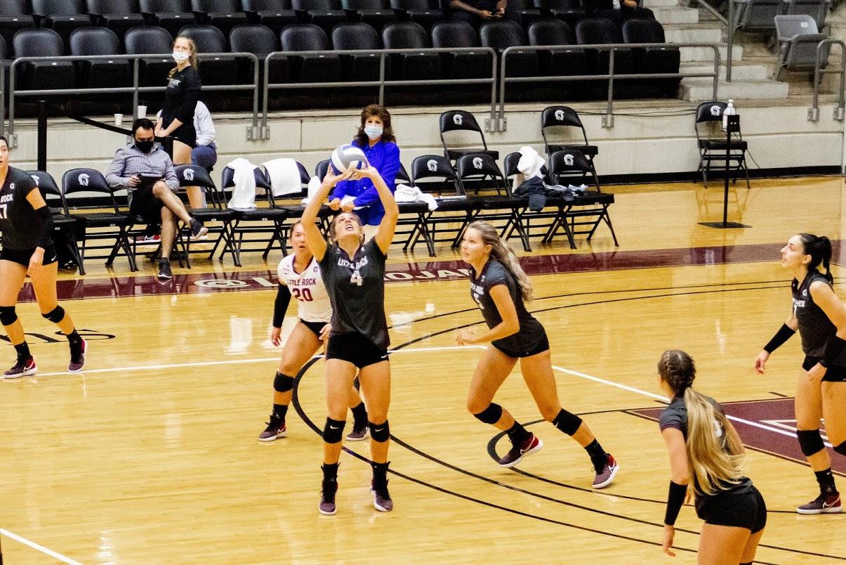 Sophomore ALYSSA NAYAR (4) puts the ball in game against Lousiana. Photo by Maggie Risley