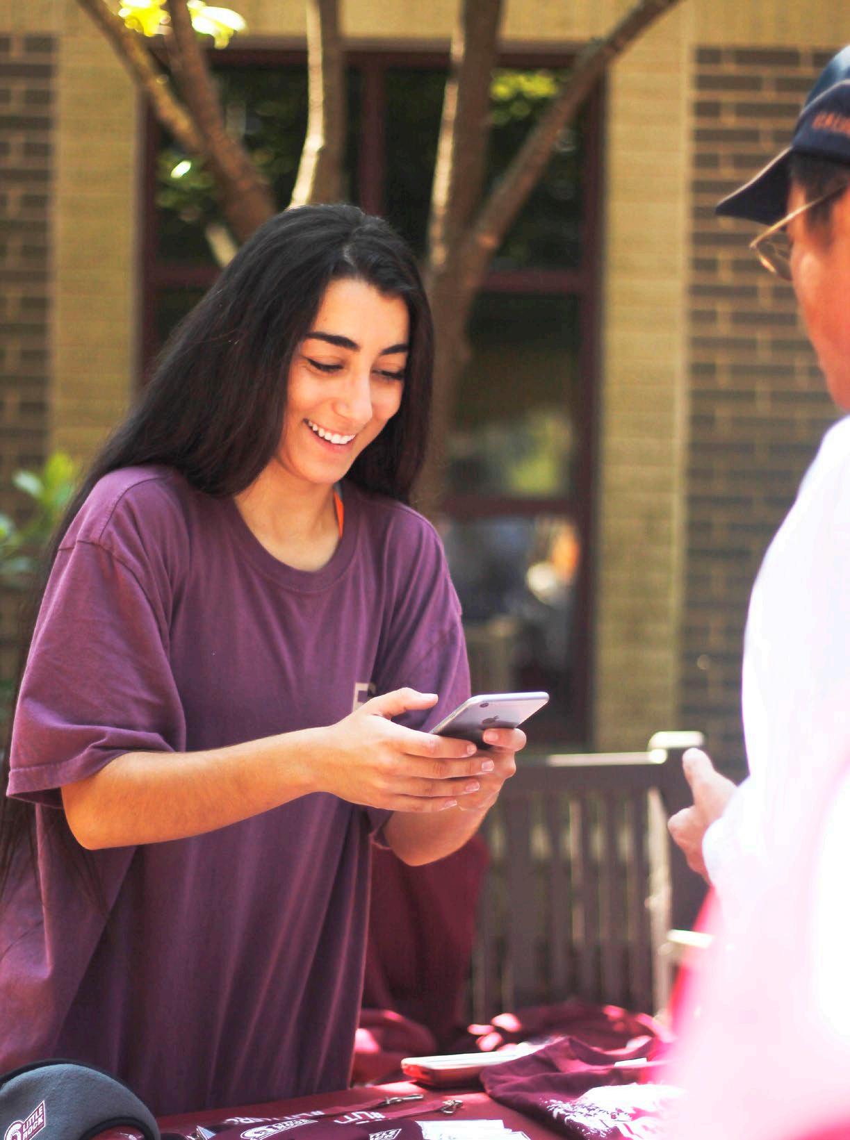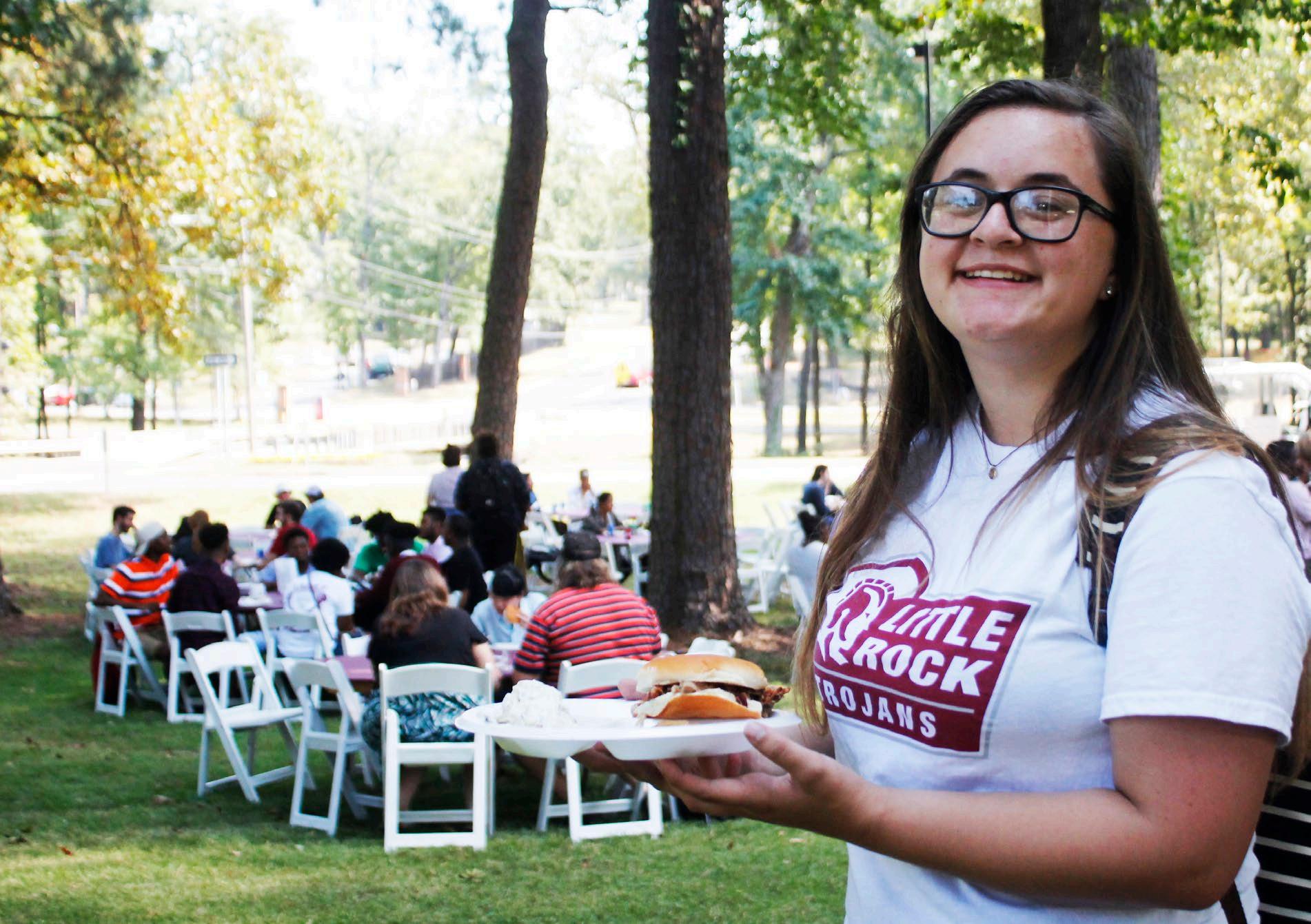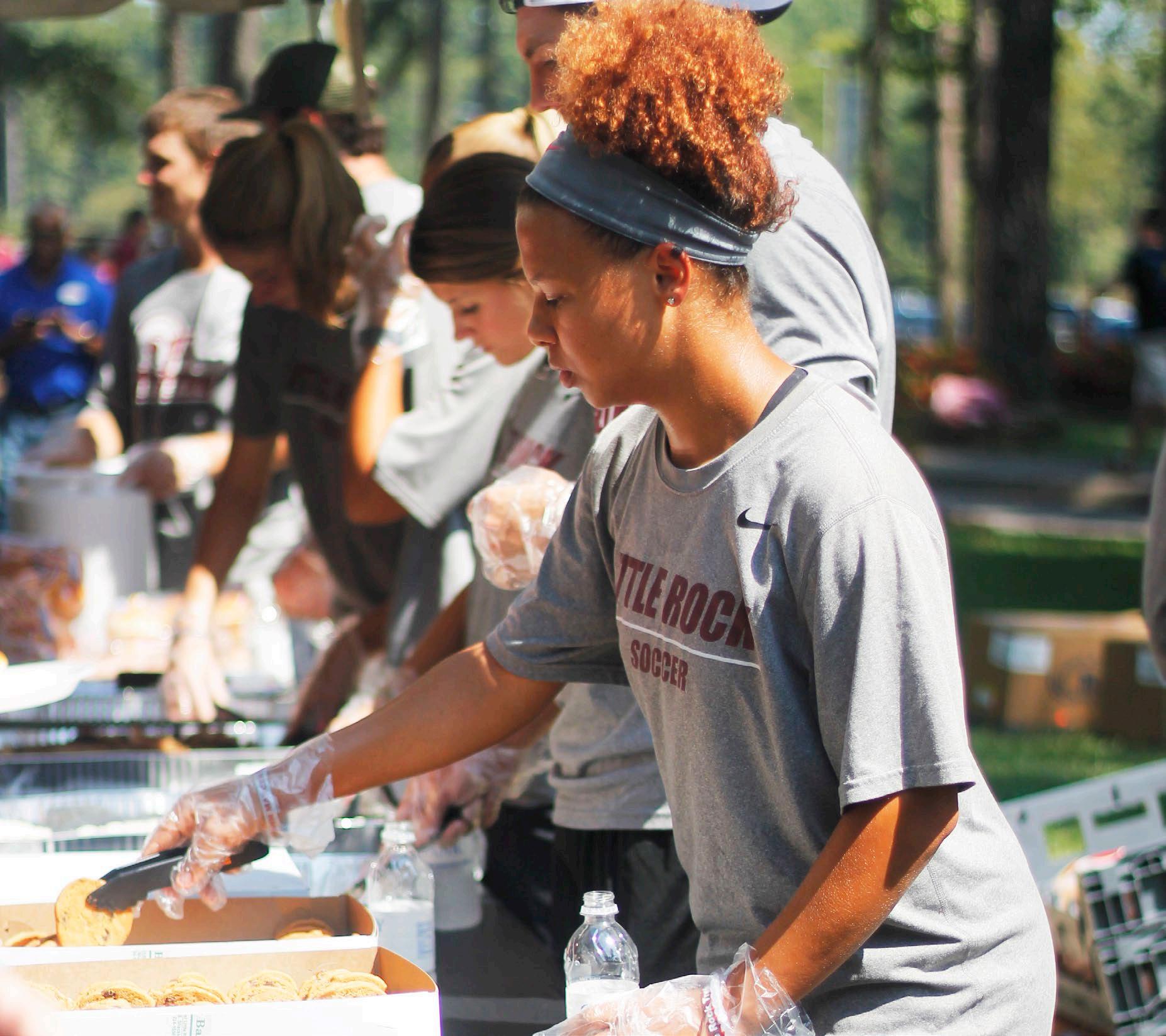 TOP: Sophomore, Sara Simons enjoys BBQ after her classes. LEFT: Many athletes spent their lunch break serving fellow students and alumni. Senior soccer player, Mikayla Uyokpeyi serves cookies from Community Bakery. RIGHT: President of Maroon Mob, Neden Yacine encouraged students to sign up to be apart of the organization. When students showed proof of check-in, they received a free T-Shirt.