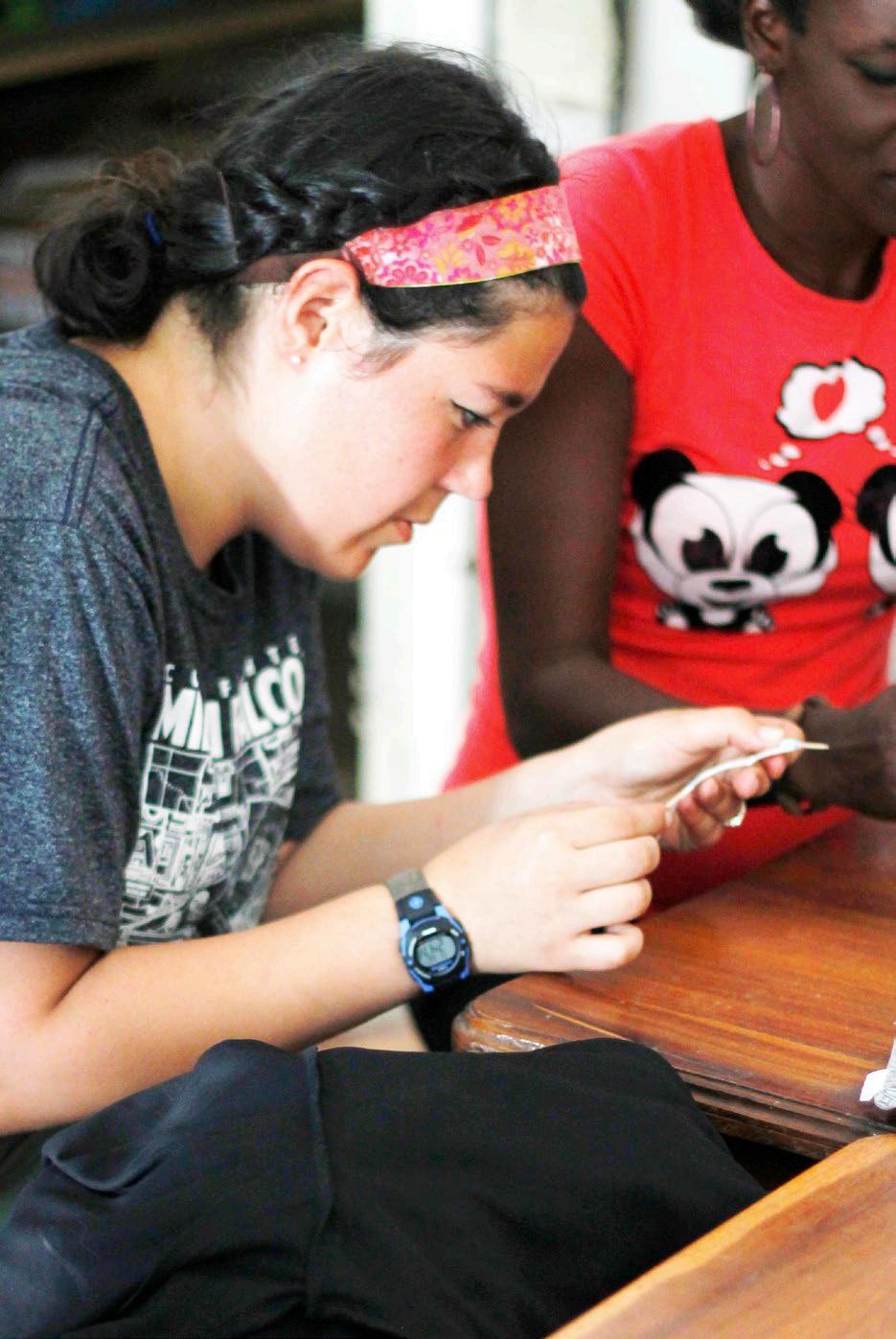 LEFT: Junior Tina Robertson rolls paper beads with the women of Hope Art. Through hand made jewelry, Hope Art raises money for orphans and widows.
